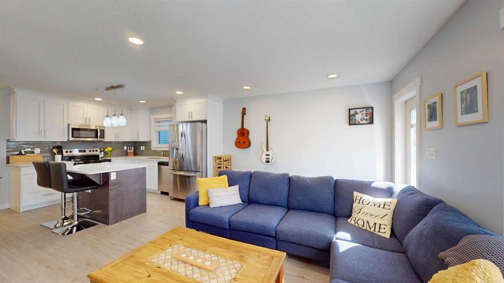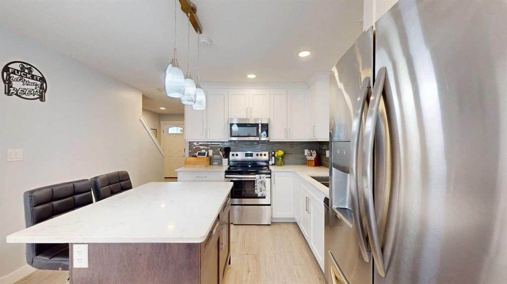 Step inside to a bright, open-concept main floor featuring a welcoming living room and eat-in kitchen with crisp white cabinetry, quartz countertops, and stainless steel appliances. A 2-piece bathroom and access to the heated garage complete this level.