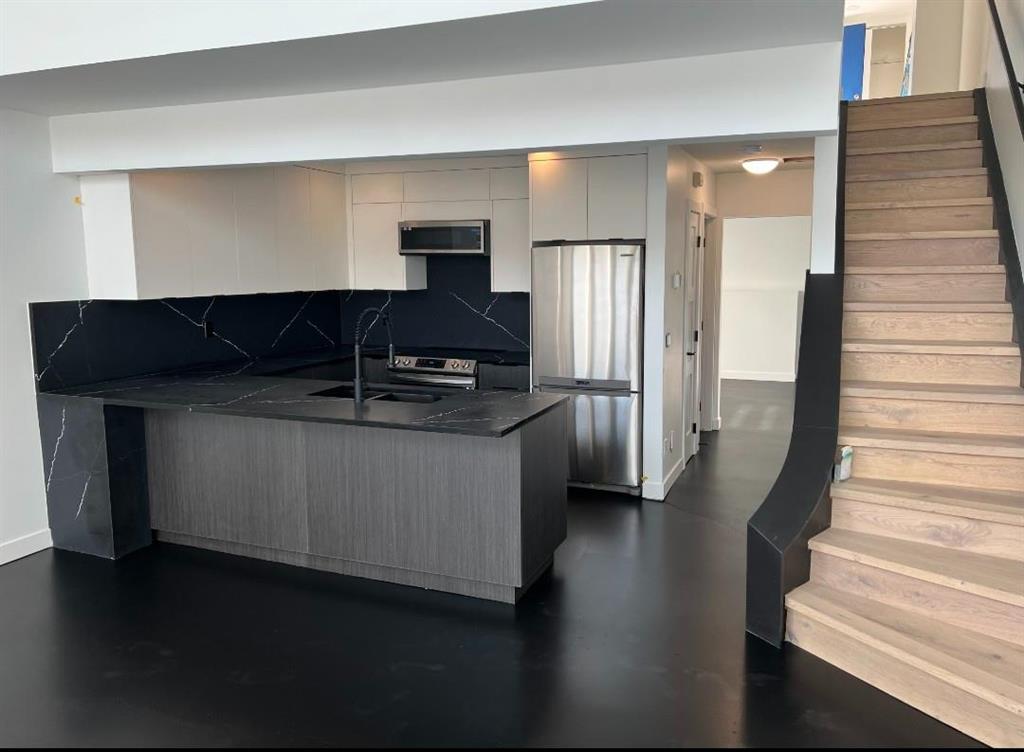 New York loft style inner city living with a view! Designed by award winning architect Jeremy Sturgess and situated in the vibrant community of Bankview, this updated, modern, loft style townhome has a lot to offer. Highlighted by dramatic architecture, soaring 2 story ceilings and stellar downtown views. Stunning main living area features 17\' floor to ceiling windows, chic concrete floors, oversized patio space plus and updated kitchen. 2 tone crisp white & wood grain cabinetry with upgraded stainless-steel appliances clad in marble-style quartz countertops completes the kitchen. 2 generous bedrooms each with their own lavish ensuite and located on their own level. Upper loft area makes an ideal flex space, home office or gym. Heated, secure underground parking with adjacent heated storage locker. Keep your car parked and walk to numerous eclectic dining, shopping and entertainment options. Minutes to off leash dog park and Sandy Beach park and pathways. Easy access to the downtown core and major road arteries.
