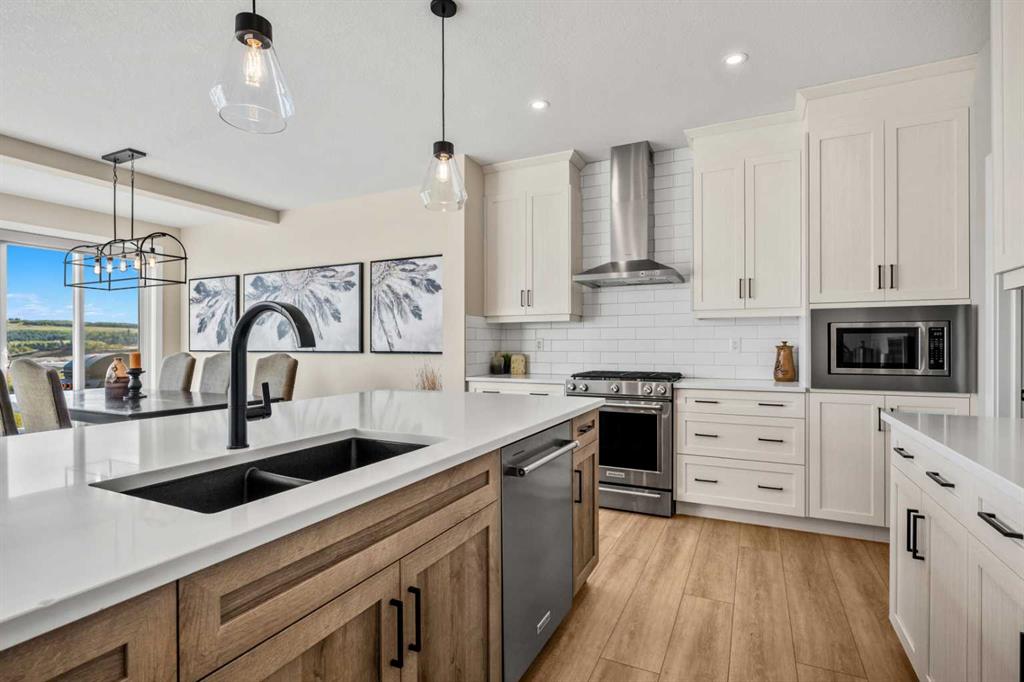 OPEN HOUSE SATURDAY OCT.4/25 - 1PM TO 3PM The One You’ve Been Waiting For – A Rare Find in Hudson at Pine Creek. Some homes check boxes - this one stops you in your tracks! A fully finished 2-storey walk-out in Hudson at Pine Creek, crafted for those waiting for the perfect home. With 2,600+ sq. ft. above grade and a beautifully developed lower level for 3,700+ sq. ft. total, it delivers lifestyle and setting. Towering windows frame rolling Foothills views, endless south/west skies, and trails steps from your back gate - a backdrop you won’t find again. Inside, every detail feels elevated yet inviting. The gourmet kitchen commands attention with its oversized island, gas range, full coffee bar and walk-through Butler’s pantry with custom live-edge countertop - ideal for daily living and stylish hosting. The open layout flows across wide-plank blond LVP floors under a soaring staircase that floods the entry with drama and light. Off the main living area, a massive deck with gas BBQ hookup and updated Tuffdeck finish spans the back. Function meets polish with a spacious double garage leading to a mudroom with custom built ins. A main floor office/library/playroom adds versatility. Upstairs, the private primary retreat impresses with double walk-in closets, spa-like en-suite, and elevated views. The bonus room showcases panoramas, while two more large bedrooms (both with walk-ins) sit nearby. A dream laundry and well-planned bath make the upper floor both practical and stylish. The finished walk-out basement sets this home apart. With its own kitchen, oversized bedroom, bright living space, and abundant natural light, it’s perfect for multi-generational living or adult kids needing independence. Not using the illegal suite? Imagine the ultimate games room, home theatre, or an epic bar—this level adapts to your vision. Step outside to a maintenance-free yard with premium artificial turf and direct trail access. A large playground across the street offers open space for games and gatherings. Extras push this home over the top: exterior wrapped lighting (no more Christmas lights), programable motorized blinds that let in light while blocking heat, custom built-ins, upgraded powder room vanity, AC, and dual-zoned HVAC. Even the exterior is fully finished for pure, no-maintenance enjoyment. If you’ve been waiting for a home that stands out—a rare blend of style, function, and setting—this is it! Move-in ready, unforgettable, and truly one-of-a-kind.