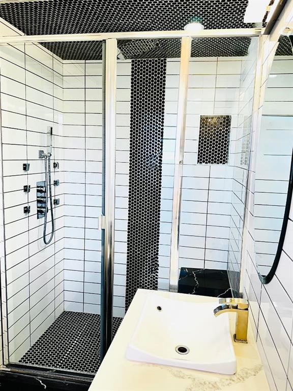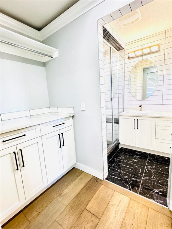 The gourmet kitchen is a chef\'s delight, featuring sleek shaker-painted cabinets. It showcases premium Whirlpool stainless black series appliances, including built-in oven and microwave, a gas cooktop, and a 36-inch French door refrigerator. A functional island with its own LED lighting completes this stunning space.