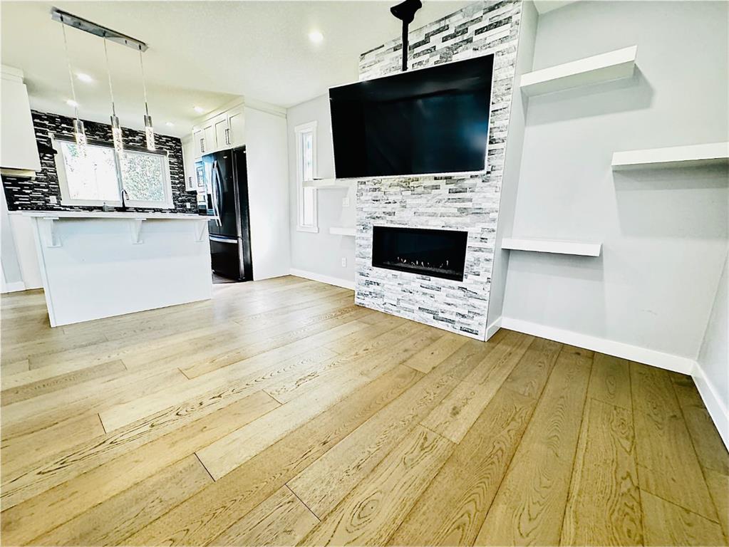 The main level boasts gorgeous engineered hardwood flooring throughout principal rooms. The living room is bright and spacious, highlighted by a massive 10-foot window, an in-wall gas fireplace surrounded by chic brick decor and ceiling mounted smart TV.