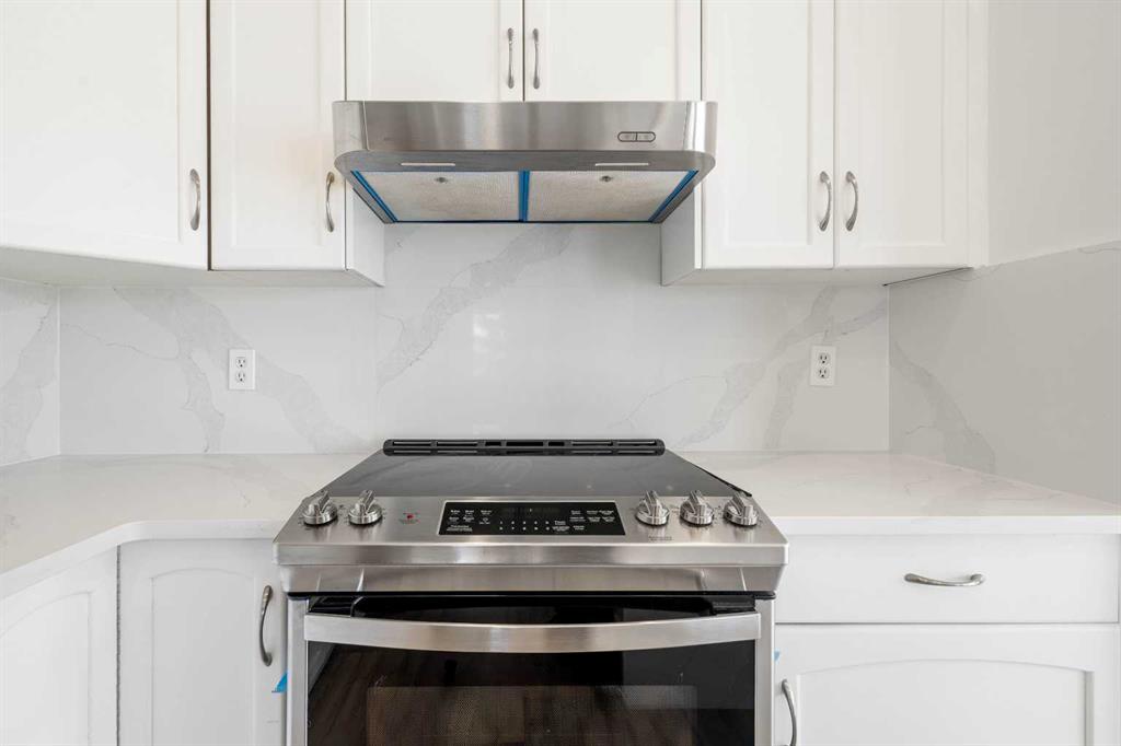 The contemporary kitchen is a chef’s dream, featuring a show-stopping Calacatta quartz waterfall island, matching quartz backsplash, and a full suite of new stainless steel appliances including an electric range, range hood, dishwasher, and a recently purchased refrigerator.