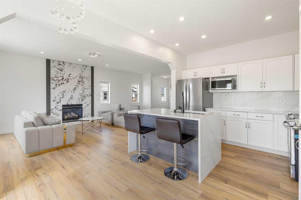Step inside to discover a bright, open-concept main floor with 9’ ceilings, large windows that flood the space with natural light, and breathtaking ridge views from the living and dining areas. The spacious living room showcases a sleek one-piece Calacatta quartz fireplace surround, while the adjacent dining area is ideal for family meals or entertaining.
