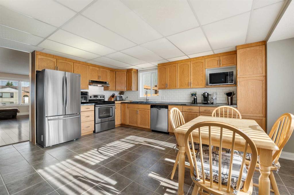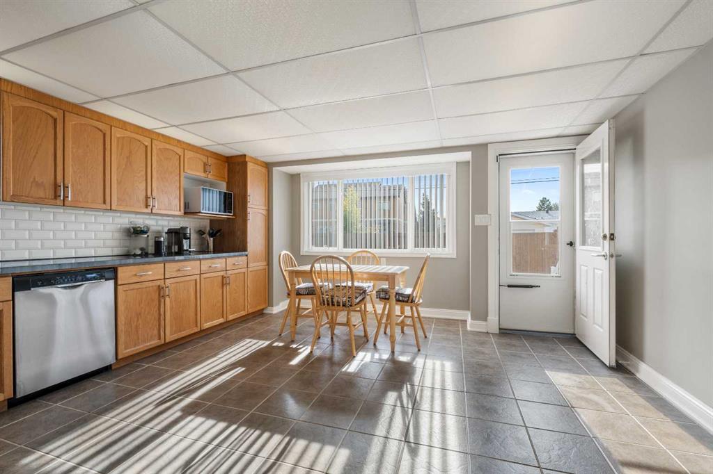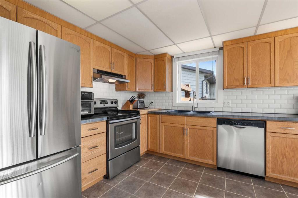 The large kitchen overlooks the backyard and features updated stainless steel appliances, a stunning backsplash, solid wood cabinets, a pantry, and plenty of counter space for cooking and gathering.