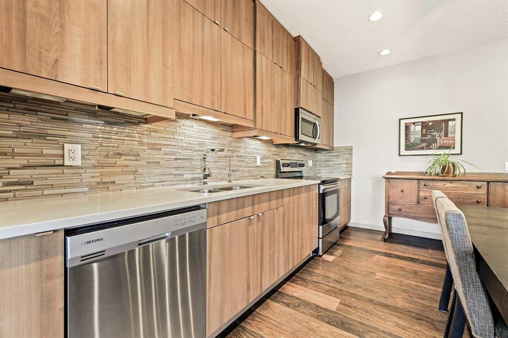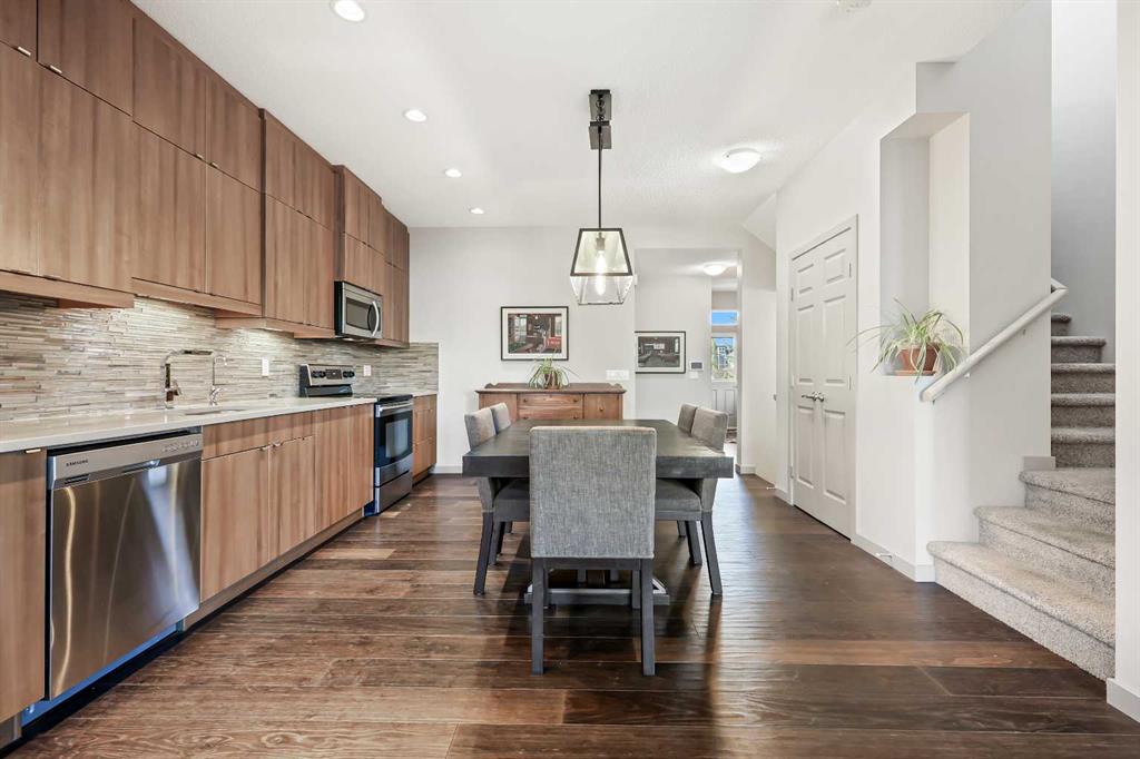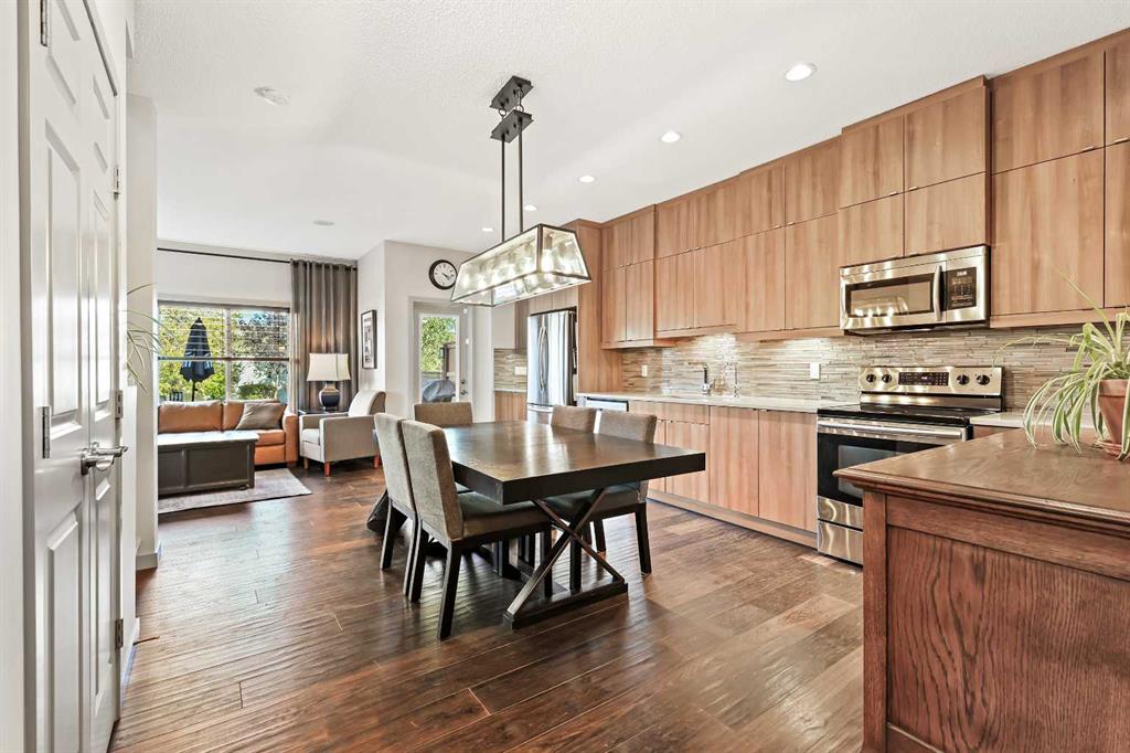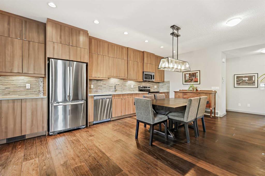 From the moment you arrive, the curb appeal stands out with craftsman-style details, a welcoming front entry, and mature trees. Inside, the open concept main floor showcases rich hardwood flooring, recessed lighting, and oversized windows that fill the home with natural light. The contemporary kitchen is a showpiece with full-height cabinetry, stainless steel appliances, a sleek tile backsplash, pantry storage, and an expansive dining area that flows seamlessly into the living room, creating a warm and inviting space for entertaining or relaxing with family.