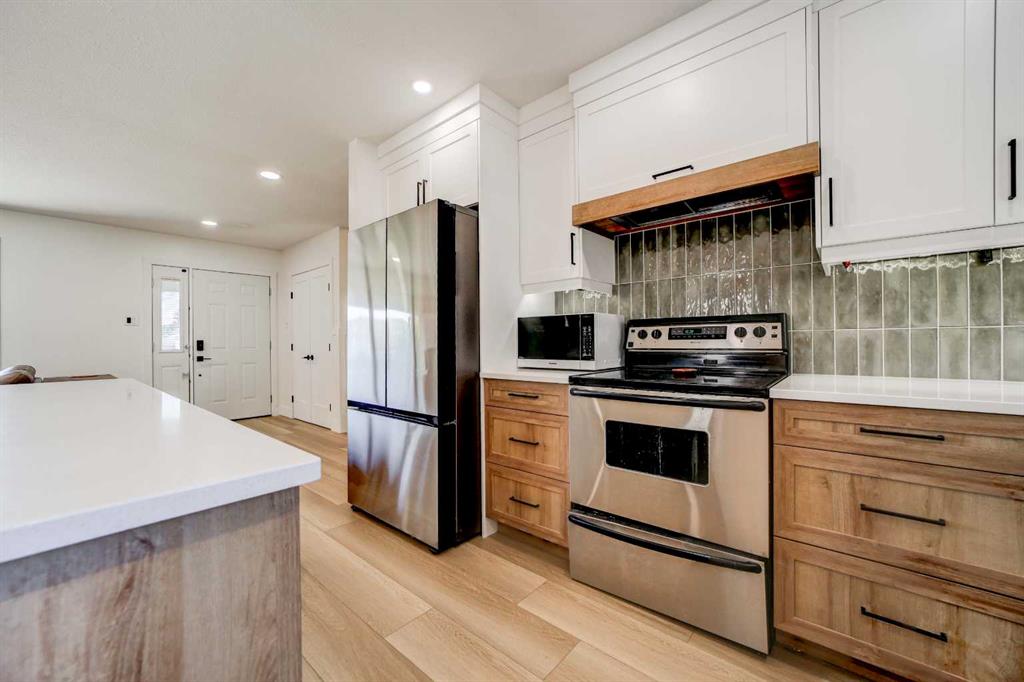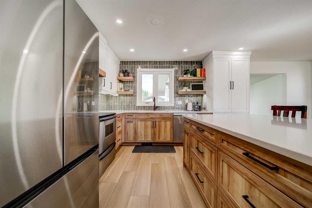 Step through the front door and experience the fresh, modern updates throughout this stunning, multi-level home. The open concept design features two-tone cabinetry in white and wood grain, complemented by white quartz countertops, a custom-built hood fan, pots and pan drawers, undermount sil granite sink and floating shelves accented by back lighting. New vinyl plank flooring, paired with custom registers, beautifully ties together the space together.