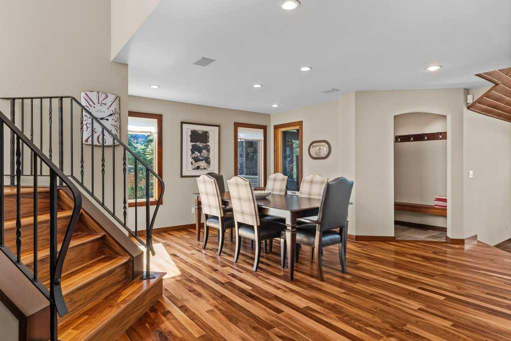 This 5-bedroom, 4046 sq ft home in the peaceful enclave of Blue Grouse Ridge offers space, comfort and mountain charm. The generous foyer opens into a spacious Great Room, featuring rich walnut flooring. In addition, select sections—such as the foyer, powder room, main-level hallway and mudroom, feature elegant travertine flooring, offering timeless natural stone appeal and durability. The living room boasts a striking Rundle stone gas fireplace and vaulted ceilings. The custom kitchen is thoughtfully designed with a premium Wolf Gourmet Range and a large island—perfect for culinary enthusiasts. Also on the main level is a spacious dining room that opens onto a large, sun-filled view deck—complete with a luxurious hot tub, rear yard, and an impressive outdoor stone wood-burning fireplace, ideal for entertaining or relaxing under the stars. The family room, with vaulted ceilings and a cozy Riverstone wood-burning fireplace, is framed by French doors that offer privacy. Up the Walnut staircase with elegant wrought-iron railings, you\'ll find a serene master retreat with vaulted ceilings and a spa-like ensuite, featuring a steam shower and soaker tub. Two additional bedrooms and a four-piece bath complete the upper level. The lower level includes a home theatre room, a gym or games area, two additional bedrooms and a 4-piece bathroom, a wine cellar, an enormous storage room—and in-slab heating throughout for year-round comfort.