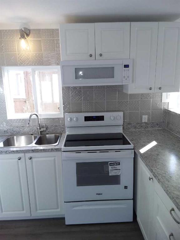 Affordable living at its best! Available immediately! This 2 bedroom, 1 bath beauty has been refurbished with stylish vinyl plank flooring throughout and completely repainted. The bright kitchen has modern white cabinets, a huge peninsula and a stylish, modern backsplash. The home includes all new appliances, (with warranties) including a stacked washer / dryer set and microwave / hood fan with direct ventilation. The bedrooms are a good size, with double closets in each. New light fixtures throughout, including LED lights and bulbs. Kitchen and bath fixtures are new and upgraded. Every inch of this home is clean and fresh! The exterior has been clad in maintenance free vinyl siding plus a aluminum soffits. Double paned vinyl windows with new drapes add to the comfort. This home is on a large, level lot that is partially fenced and includes a garden shed on a new base. The parking pad in front has space for 2 vehicles. Listing agent is the current owner.
