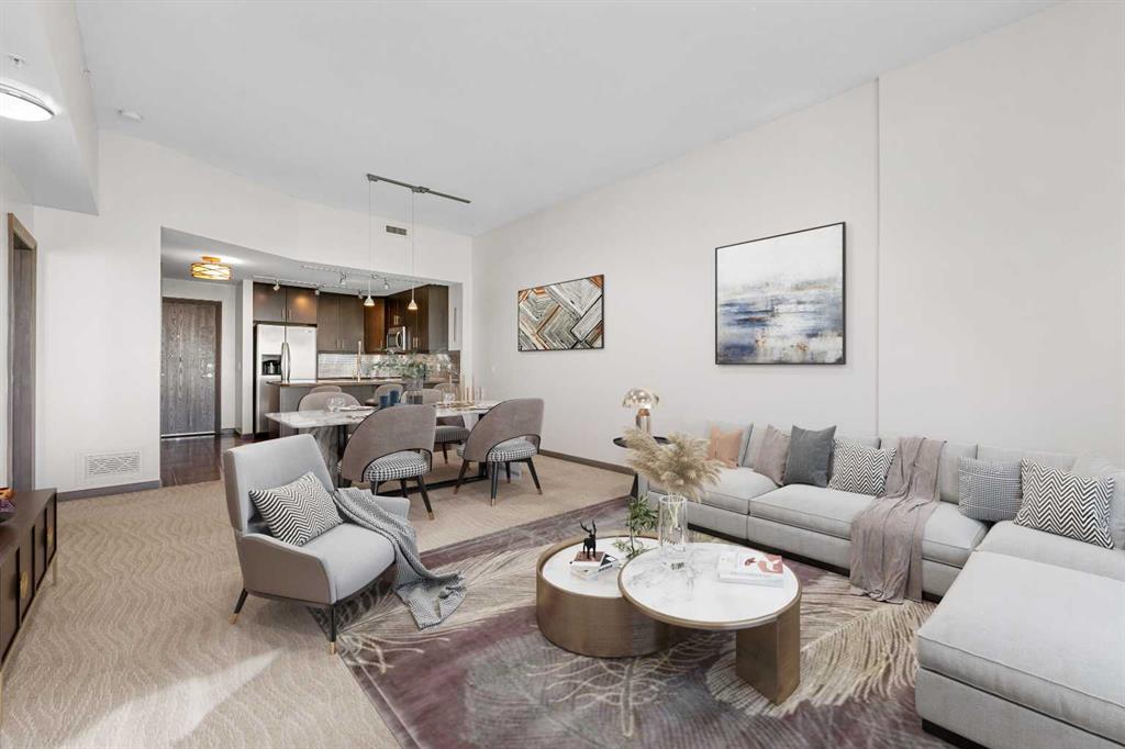 Perched high on the 32nd floor, this stunning south-facing unit offers breathtaking panoramic views of the Rocky Mountains and Stampede Grounds through floor-to-ceiling windows. With soaring 10 ft ceilings, the space feels bright, open, and luxurious. The kitchen boasts granite countertops, stainless steel appliances, and a stylish backsplash; a perfect place for creating delicious meals for yourself and guests. A massive living room makes the most of the incredible views with floor to ceiling south facing windows giving you a magnificent space to curl up with a good book and gaze at our wonderful city. The spacious bedroom features a walk-through closet leading into the bathroom; a great place to rest your soul after a day of fun and adventure. To further support your carefree lifestyle this home also includes air conditioning, titled underground parking and a storage locker for your convenience. The building offers resort-style amenities including concierge service, a large fitness center, hot tub, steam room, theater, and party room. This condo is the idyllic home for you with stunning views, luxurious space and amazing amenities all within your own building.