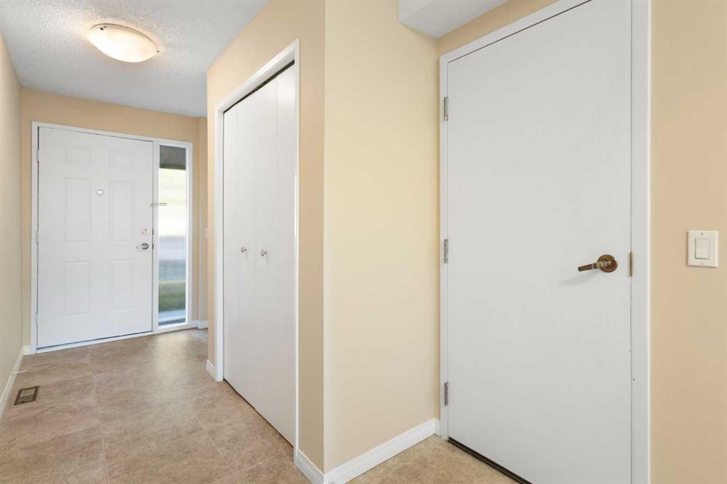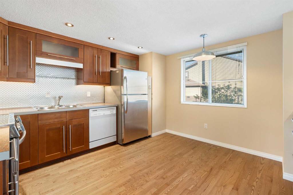 EASY LIVING in Glamis Gardens! Terrific end unit Townhome has wonderful natural light throughout the spaces. Separate entry level with closet and access to the attached two-car garage provides a nice introduction to the unit. Step up to the bright living room with vaulted ceiling and sliding doors out to the large private, professionally designed cobblestone patio and garden (please also see Supplements). On the next level are the kitchen, dining and family rooms. Kitchen features beautiful custom cabinetry, checker plate backsplash, plenty of counter and cupboard space, tempered glass raised eating bar, upgraded lighting and full pantry. Separate dining area to comfortably host your guests. Relax in the family room with warm fieldstone wood burning fireplace. Gleaming solid Quebec hardwood (see Supplements) throughout the living, dining, kitchen and family rooms. Two-piece bathroom with custom sink completes this level. Spacious master bedroom with previously upgraded (see Supplements) three-piece ensuite and dual closets. Two other good-sized bedrooms (currently configured as a large single bedroom, great for combined sleeping and work space) and upgraded main bathroom complete the upper level. Partial basement utility space provides open laundry area, storage and large crawl space. Recent updates include; Freshly Painted (Oct. 2025), Stove (2024), Microwave/Hood Fan (2024), Garage Door (2023) and High Efficiency Furnace (2022). Unit, carpets, furnace and ducts professionally cleaned just prior to listing. Minutes from Westhills shopping, restaurants, and services, plus Canadian Tire, London Drugs, Co-Op, and many more. Close to schools, Mount Royal University, and transit. Easy access to Sarcee, Glenmore and Stoney Trails so very quick to get around town or go out of town. READY to move in, RELAX and ENJOY!