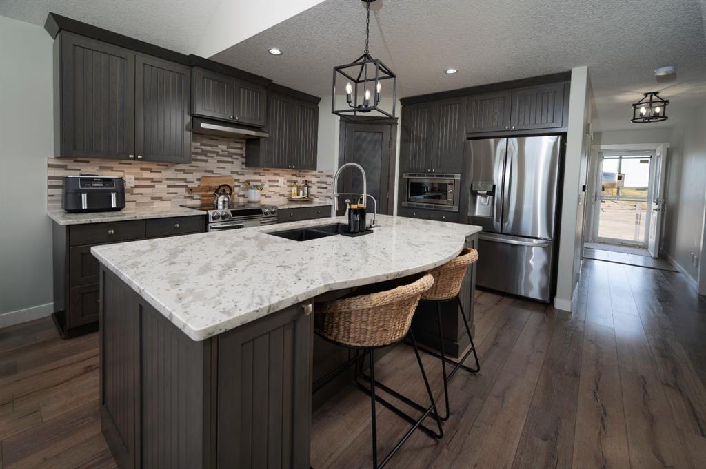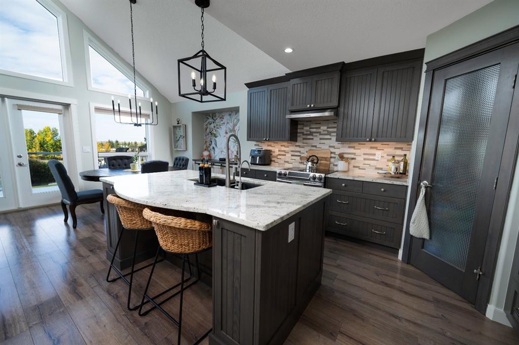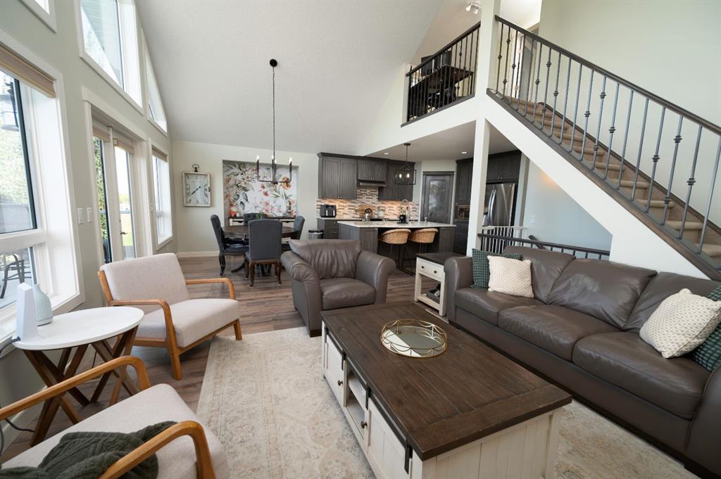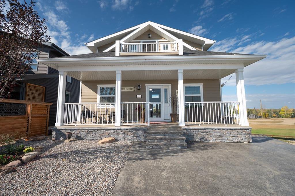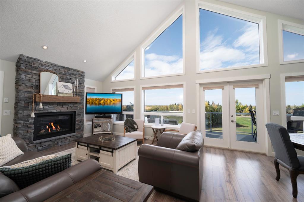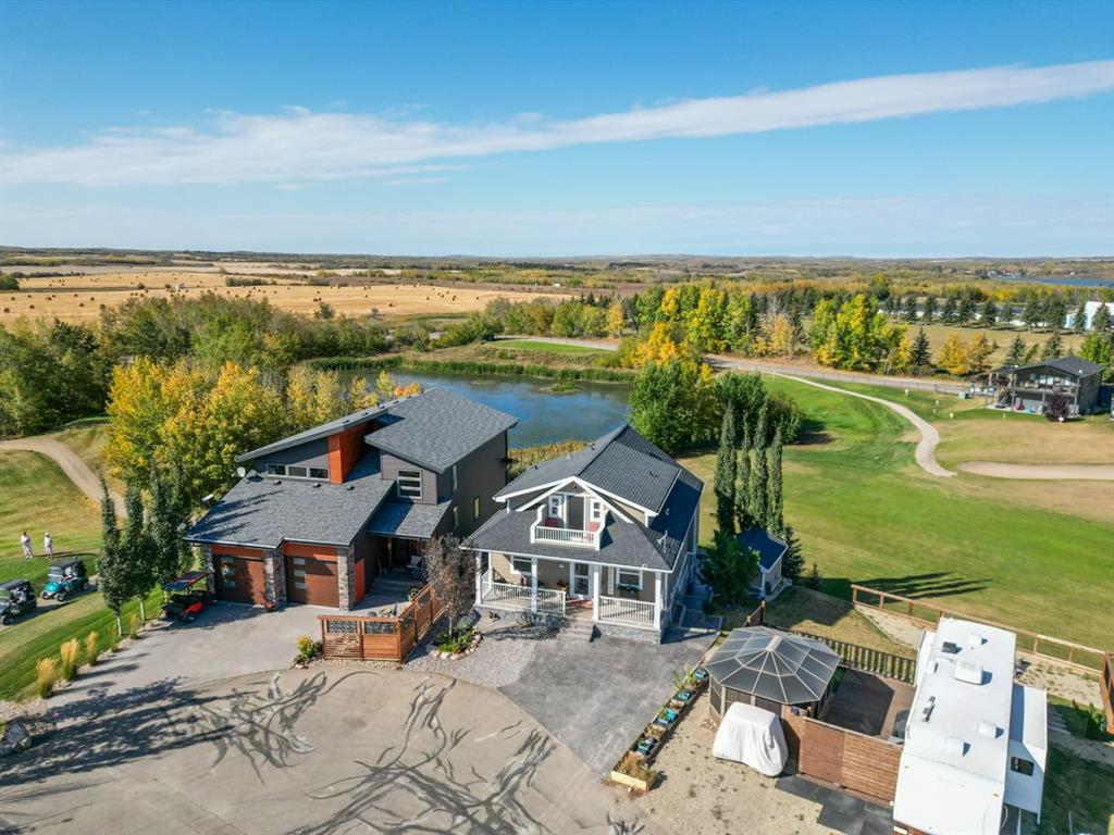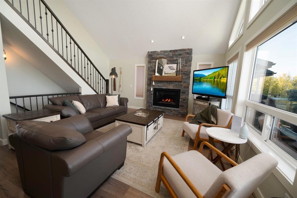 SHOWS LIKE A 10! Beautiful walkout chalet at Whispering Pines on Pine Lake! This fully finished 1.5 storey home is a show stopper, with a wall of windows overlooking the golf course as you enter the home. A large front entry beckons you in past the guests half bath and laundry, and the main floor bedroom with attached ensuite. The spacious kitchen is bathed in natural light, with a large centre island, granite counters and stainless appliances. The living room features a gas fireplace, and the dining room leads to a large rear deck with views for miles! Upstairs you will find a mezzanine office area that leads to the huge primary bedroom with full ensuite and walk in closet. Do not overlook the private upper level patio accessed from the primary bedroom, perfect for that morning coffee to watch the sunrise! The walkout basement offers a huge rec are plus games room, full wet bar and additional bedroom / bathroom. The full walkout basement brings you out onto a concrete patio to your private yard, beautifully landscaped with storage shed as well! Truly a beautiful property from head to toe, this is a rare find in the complex located on a quiet dead-end cul-de-sac!