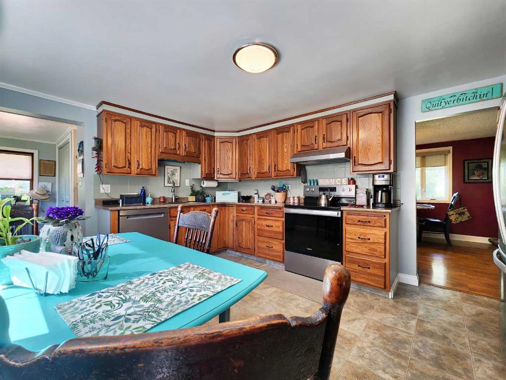 The main floor features a cozy primary suite, a bright kitchen and dining area, an inviting living room with a wood-burning stove, a 4-piece bathroom, mudroom/porch, and main floor laundry. Upstairs are two additional bedrooms, while the fully finished lower level includes a spacious recreation room, a quiet office, a fourth bedroom, and a cold storage room.