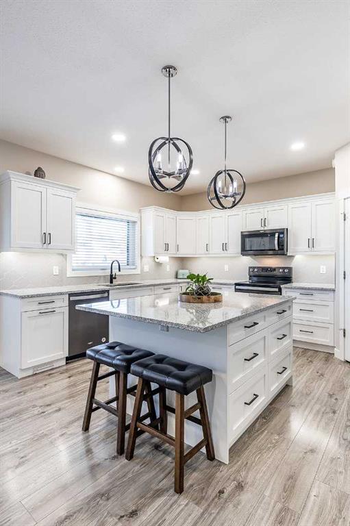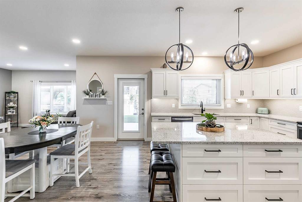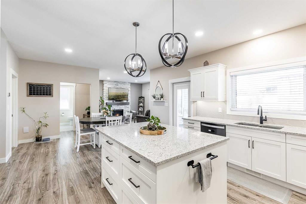 Welcome to 258 Ranchview Crescent NE – a stunning modified bi-level with undeniable curb appeal in the highly sought-after Ranchlands community. Backing onto a large green space and walking path, this home offers both privacy and a beautiful natural setting. Inside, you’ll find 4 bedrooms, 3 full bathrooms, and a thoughtfully designed open-concept main floor. The kitchen is a showstopper with white cabinetry, quartz countertops, a large centre island, tile backsplash, and a corner pantry. It flows seamlessly into the spacious dining area and cozy living room complete with a gas fireplace. A versatile main floor bedroom can serve as a guest room, office, gym, or playroom, and there’s also a full 4-piece bathroom and convenient main floor laundry. The private primary suite, located above the garage, is a true retreat. It features a spa-like 5-piece ensuite with double sinks, a standalone tub, and a walk-in shower, plus a large walk-in closet with custom built-ins. The fully developed basement offers even more living space with a large family room, two additional bedrooms, and another 4-piece bathroom.