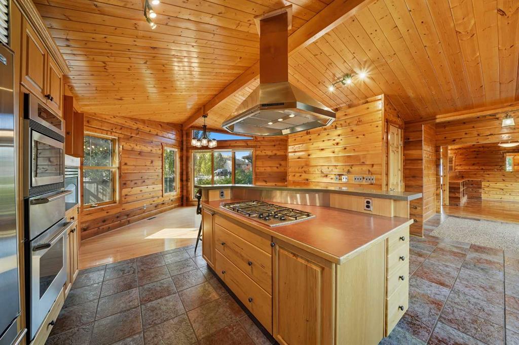 This unique two bedroom retreat features vaulted ceilings that create an airy, spacious atmosphere throughout. The heart of this home is the gourmet kitchen, complete with a gas range, granite sink, overhead range hood, and the unique charm of its own gas fireplace. A second, wood burning fireplace adds warmth and ambiance to the main living area, perfect for those crisp Alberta evenings. Both bedrooms offer comfortable accommodations with impressive vaulted ceilings, while the two full bathrooms ensure convenience for family and guests alike. The large pie-shaped corner lot provides plenty of space for outdoor activities and entertaining on the expansive deck, along with the beautifully landscaped yard and welcoming fire pit area. The deck has a NG line ready for a bbq or gas fireplace, and it is also roughed in for a hot tub in the private area adjacent to the primary suite. Upgrades include a new high efficiency furnace, hot water tank, new water lines, air conditioning, and yard irrigation system, and a fresh exterior paint job. The oversized heated double car garage and additional parking space on the side of the house provide ample space for parking guest vehicles, an RV or boat.