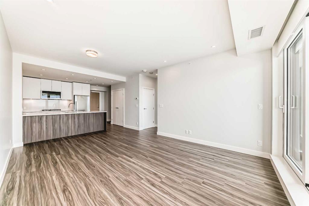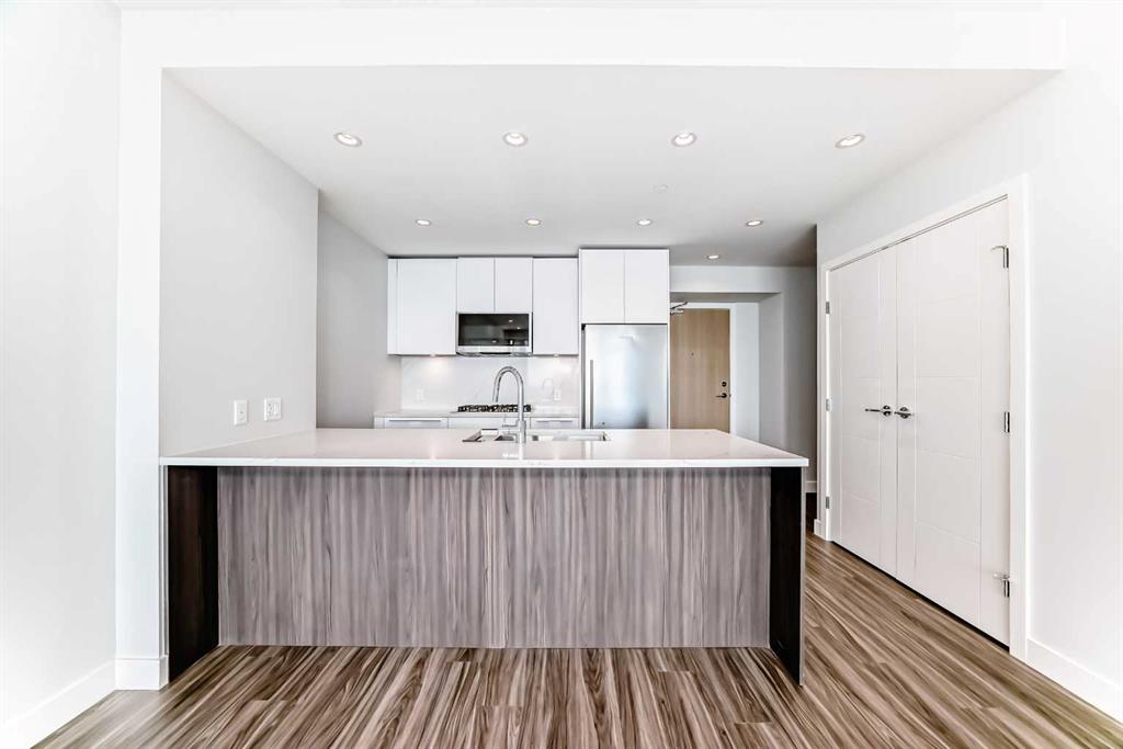 Welcome to Arris Residences! This bright and open 1 bedroom, 1 bathroom + Den home presents an open layout featuring wide-plank luxury vinyl flooring throughout, high ceilings & plenty of natural light, showcasing a generous living and dining area and has excellent access to the large south-facing balcony. The kitchen is open to the living area & is tastefully finished with quartz counter tops, eating bar, lots of storage space & premium European appliances.