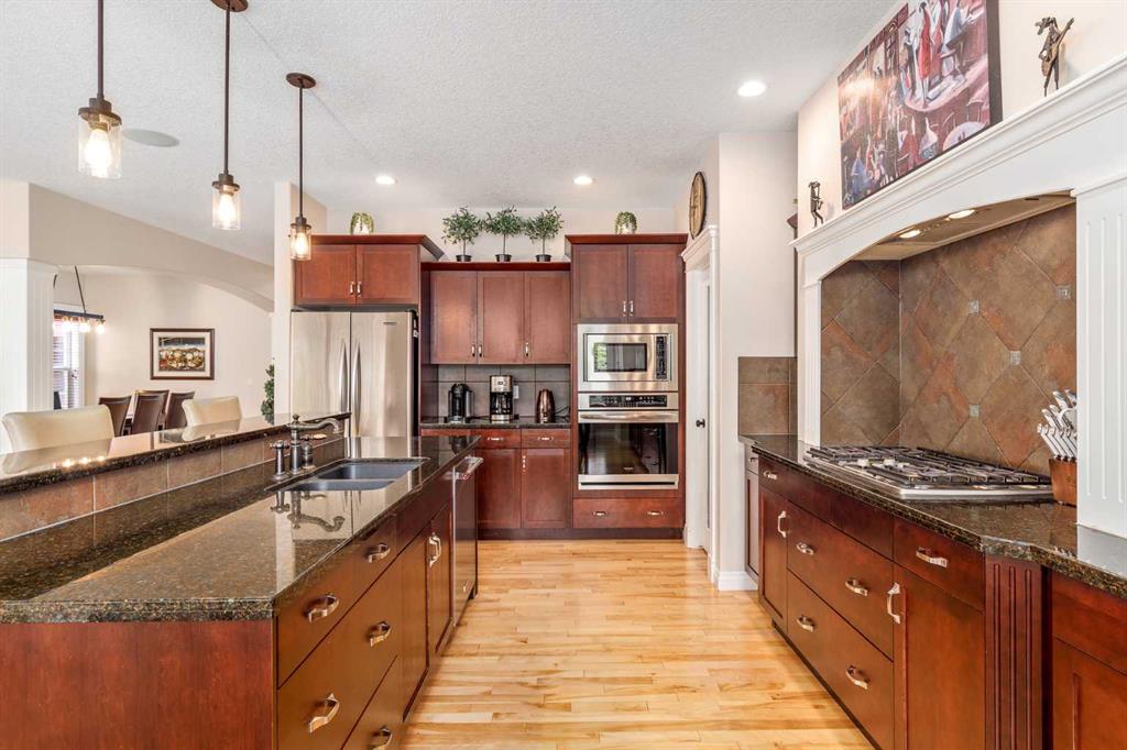 **OPEN HOUSE SATURDAY OCTOBER 18TH 1-4PM** Welcome to this meticulously maintained, original-owner Morrison-built home tucked away on a quiet crescent in the heart of Auburn Bay. With an oversized pie-shaped, southwest-facing lot that’s both well-treed and private, and just four houses from the playground, this property perfectly blends family living with an unbeatable location. Step inside the vaulted front entry, where a spacious den sets the stage for a home office or study. A formal dining room with bright windows and a niche adds elegance for entertaining. At the back of the home, a welcoming family room with a central gas fireplace flows into the expansive kitchen and sunny breakfast nook. The kitchen features a large island with raised breakfast bar, gas stove, dark stained cabinetry, sleek black quartz countertops, stainless steel appliances, and a classic box-style hoodfan that gives the space an elevated, timeless feel. A built-in bar with wine rack and glass accents doubles as a coffee station, while a full pantry keeps everything organized. Blonde hardwood runs throughout the main level, and a practical mudroom with a 2-piece bath connects to the double garage. Upstairs, the vaulted bonus room offers a cozy corner fireplace and is surrounded by open railings that carry throughout the upper hallway, giving the entire level a bright, open feel. Two generously sized kids’ bedrooms, a 4-piece bath, and an upper laundry room add family-friendly convenience. The primary retreat is a showstopper with dual French doors, a bay-window sitting area, massive walk-in closet, and a spa-inspired ensuite featuring dual sinks with granite counters, a large corner soaker tub, and a stand-alone shower. The fully finished basement offers even more living space with a large rec room (with barn door separation), a full-sized bedroom, 4-piece bath, sunshine windows, and loads of storage. It also includes a custom wine room — perfect for collectors and entertainers alike. Berber carpet throughout adds warmth, while central A/C keeps the home comfortable year-round. Outside is where this home truly shines. The oversized, pie-shaped lot is surrounded by mature trees, offering privacy and serenity rarely found in the community. A large back deck with gazebo overlooks the yard, while a smartly designed dog run extends directly from the deck for ultimate convenience. With a southwest-facing backyard, you’ll enjoy sun all day and evening — perfect for summer gatherings. And of course, life in Auburn Bay means year-round lake access and endless recreation: swimming, paddleboarding, skating, fishing, and more. This home is also located just a short walk from the community’s main beach entrance, making lake life part of your everyday routine. Add in schools, parks, shopping, restaurants, the South Health Campus, YMCA, and easy access to Deerfoot and Stoney Trail — and you’ve found a community that offers it all.