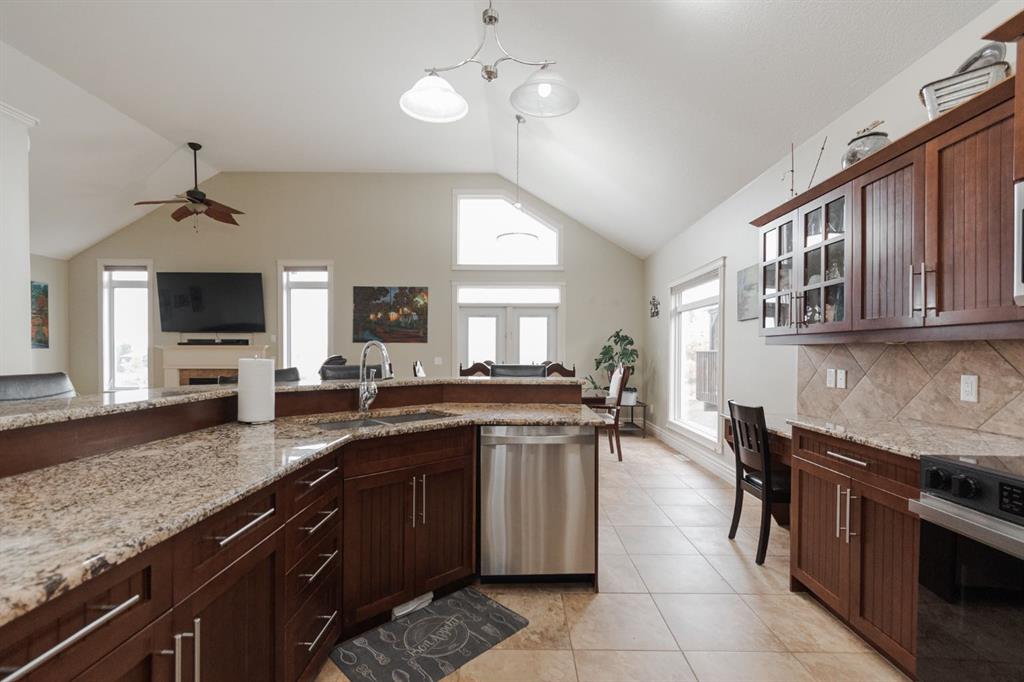 The curb appeal starts with an exposed aggregate driveway and attached 24x26 double car garage with 10 ft ceilings, epoxy floors, LED lighting, hot and cold taps, and plenty of included cabinetry — a dream set up for storage, hobbies or the perfect man cave.