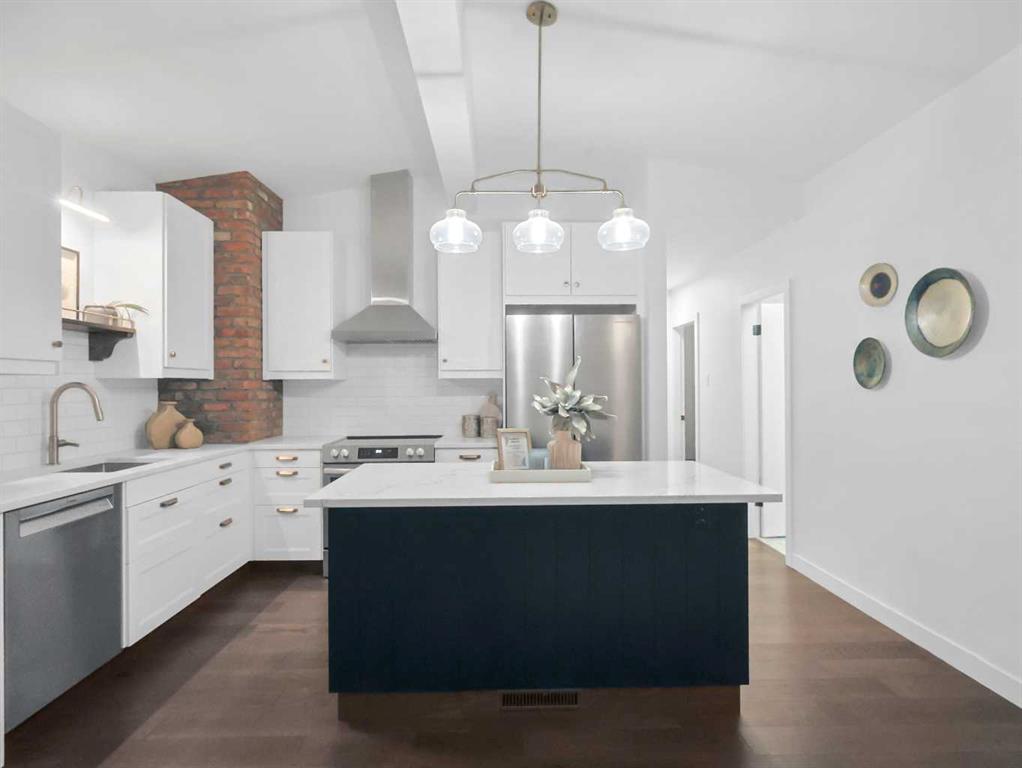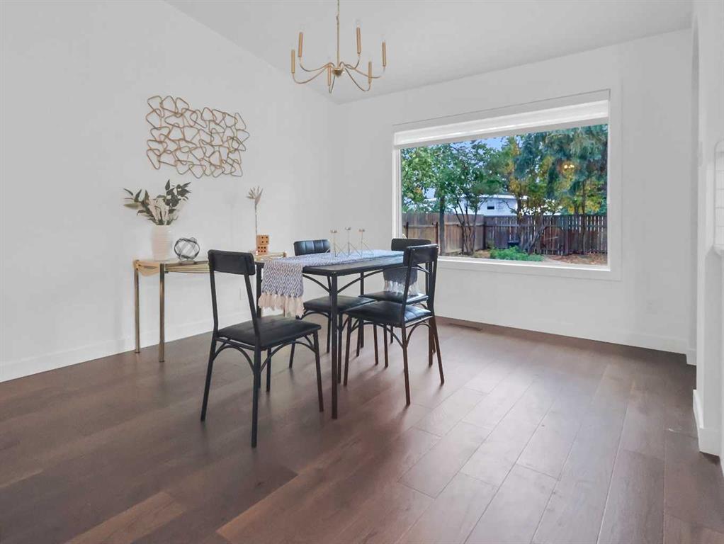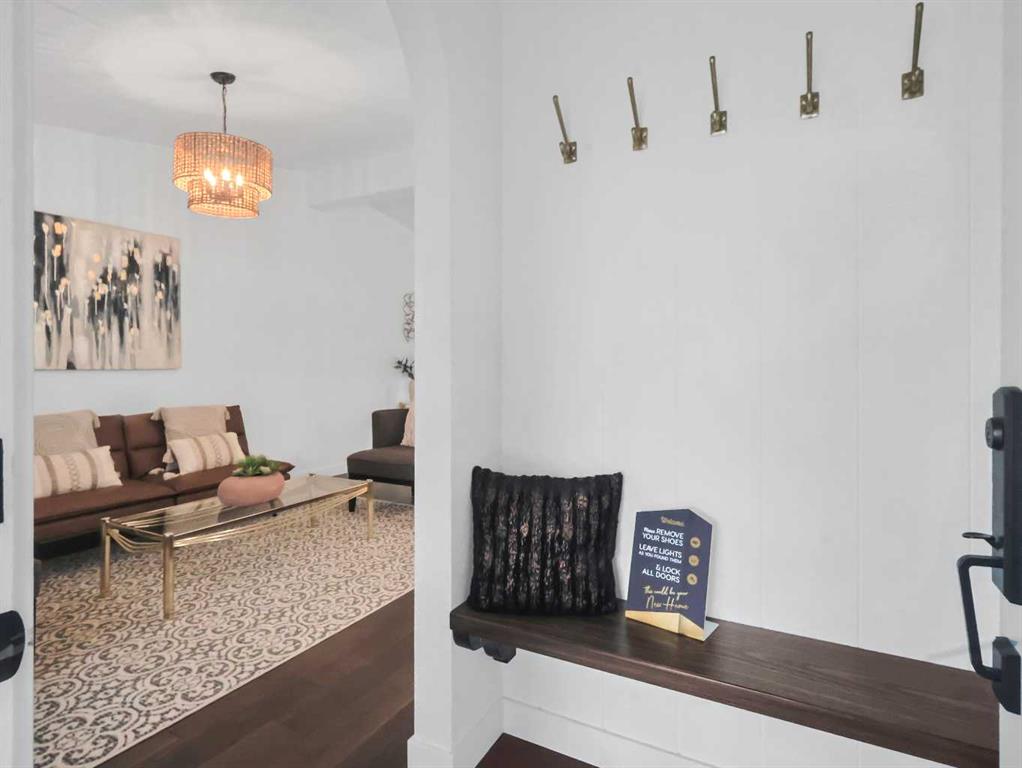 The chef-inspired kitchen features sparkling quartz countertops, brand-new stainless steel appliances, and statement designer lighting that sets the perfect mood. Rich hardwood floors flow seamlessly throughout the main level, adding warmth and sophistication to every space.