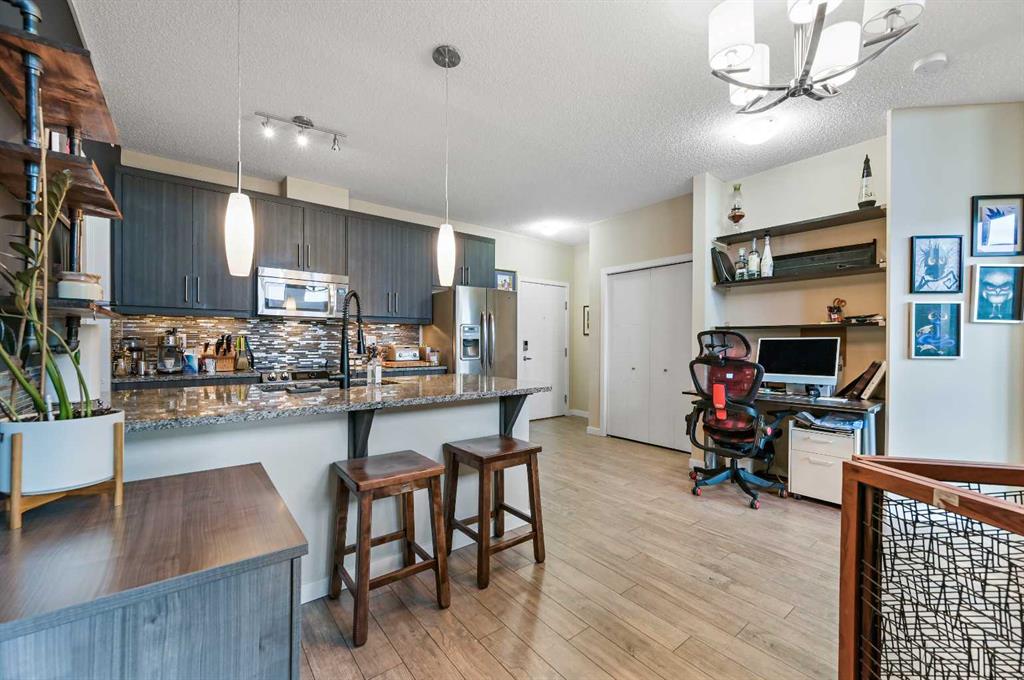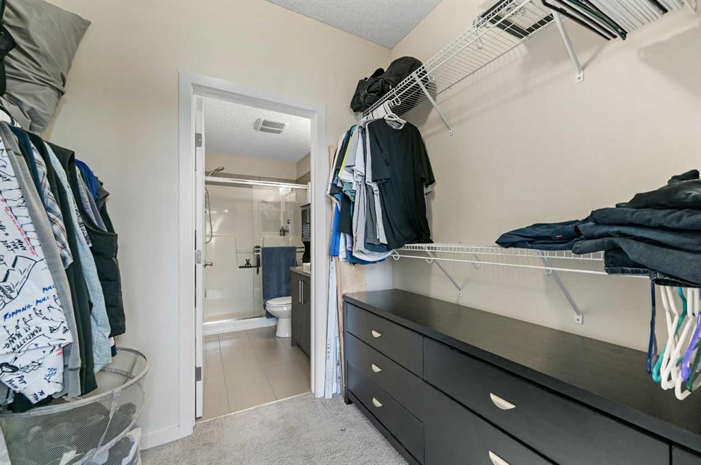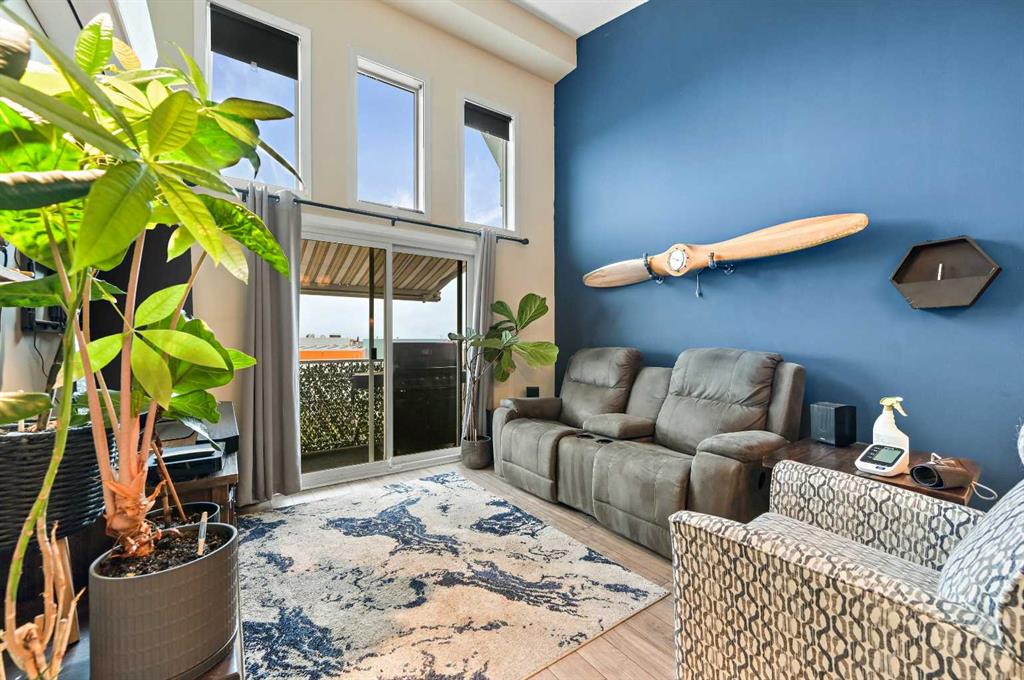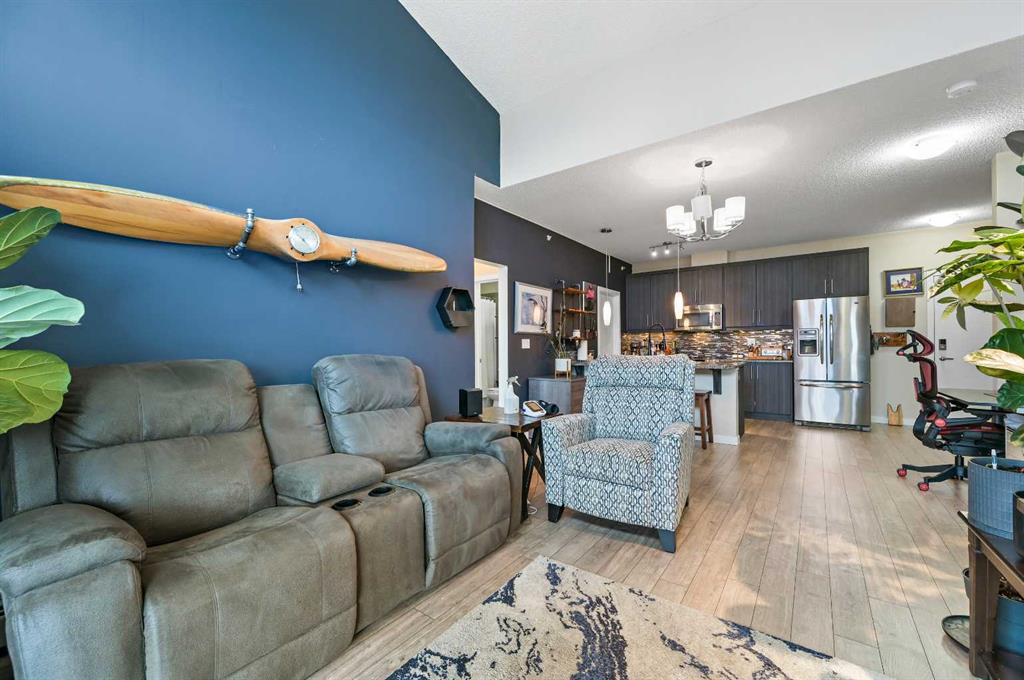 Welcome to Ebony in Mahogany—where lake living meets modern convenience! This stunning top-floor west-facing condo offers a rare combination of soaring design, thoughtful upgrades, and unbeatable location just a few blocks from the community beach and right across the street from two schools. From the moment you enter, you’re greeted with an impressive 14-foot sloped ceiling and two levels of windows in both the living room and primary bedroom, flooding the home with natural light and creating a sense of openness rarely found in condo living. Elegant French sliding doors lead out to your private west-facing deck with a built-in awning—the perfect retreat to watch sunsets, enjoy BBQ nights with the gas line hookup, or simply relax in the shade on sunny days. The kitchen is a chef’s delight with Beautiful wood-grain like cabinets paired with gorgeous granite countertops. A full stainless steel appliance package with a huge walk-in pantry for storage and organization. A convenient office nook for working from home and in suite laundry adds ease and convenience. Flowing seamlessly from the kitchen is the open-concept living and dining area, finished with stunning laminate flooring and a feature wall that adds warmth and personality. The Primary Suite feels like a sanctuary with soaring ceilings, a walk-through closet, and a spa-inspired 3-piece ensuite featuring an oversized walk-in shower with sleek sliding glass doors, granite counters, and timeless tile flooring. The second bedroom is equally impressive with a walk-in closet and access to the 4-piece main bath, ideal for guests or family. Additional features of this great home include TWO TITLED PARKING STALLS, air conditioning to keep you cool on summer days, large deck with BBQ gas line for year-round grilling, an on-site gym and playground in the complex, and visitor parking and traffic-calming school zones for added safety. Living here means more than a home—it’s a lifestyle. Stroll a couple of blocks to the private beach, explore parks, pathways, and playgrounds, or take advantage of nearby shopping, dining, and amenities. With schools across the street and quick access in and out of the community, this home is as practical as it is beautiful. If you’ve been dreaming of lake living with soaring ceilings, natural light, and modern comfort, this is the condo that has it all. Don’t wait—schedule your private showing today!