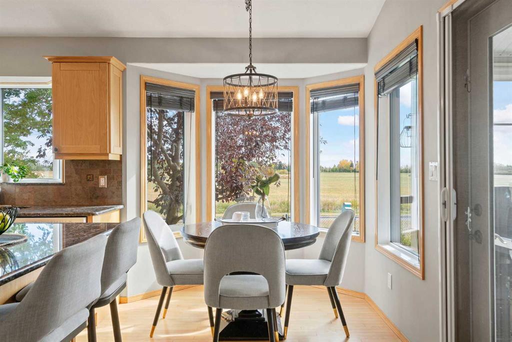 Step inside to a warm, inviting interior featuring hardwood floors, elegant dark tile accents, and plush, meticulously kept carpets. The main floor boasts a bright, spacious kitchen with clean white appliances, granite countertops, a tile backsplash, and picturesque Prairie views from every window.