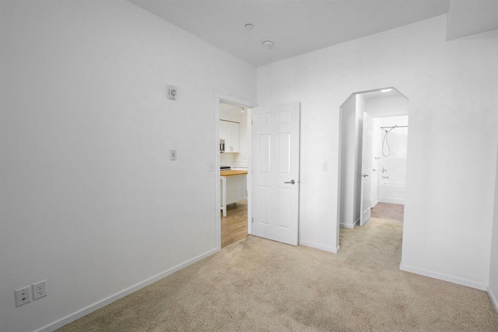 The living and dining area flows seamlessly to a private covered balcony — a quiet retreat for morning coffee, an evening glass of wine, or simply unwinding outdoors. The bedroom is generously sized, with a custom walk-through closet leading to a clean, modern bathroom with cheater access for added privacy. Every detail feels intentional and connected.