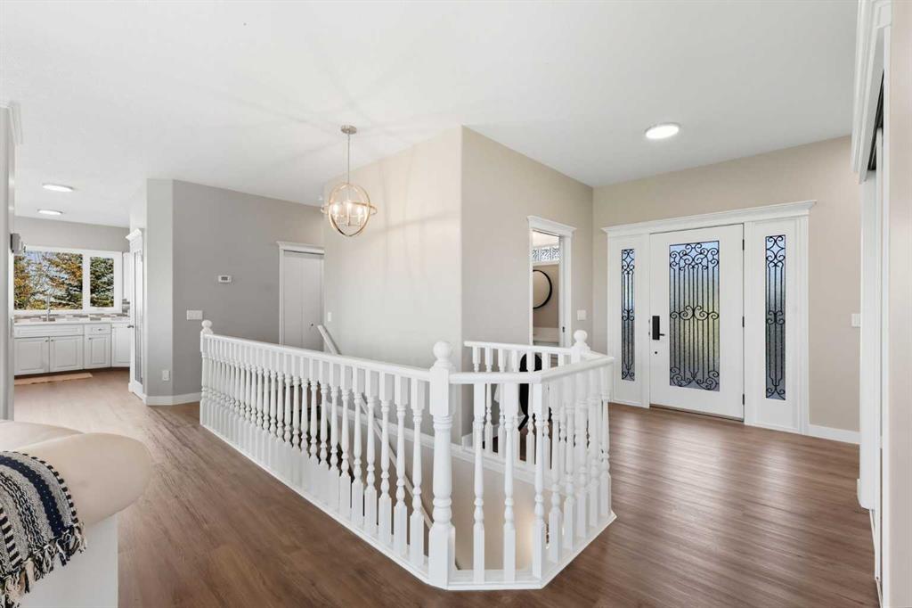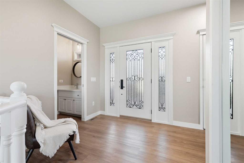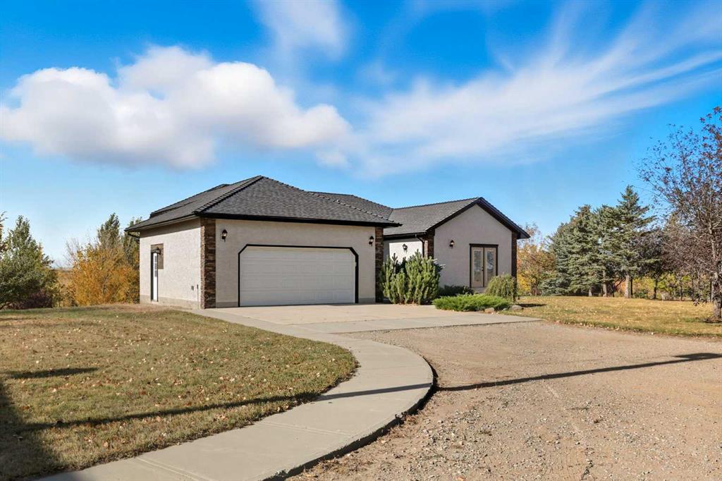 Welcome to this custom-built, 3500 sq ft developed area, walk-out bungalow perched on a scenic hilltop in Wheatland County, just 10 km north of Strathmore and only 25 minutes from Calgary International Airport. Set on 3 private, beautifully treed acres surrounded by agricultural fields and boasting unobstructed west-facing views of the Rocky Mountains, this property combines luxury living with peace and privacy. A tree-lined driveway lit with stately fixtures guides you to the home, which has been newly updated with modern paint, lighting, flooring, appliances, and decking, offering a fresh and stylish feel throughout. Designed for easy country living, the property is virtually maintenance free and finished with durable stucco and asphalt shingles. The 47’ x 31’ shop is fully insulated and heated, finished with a metal exterior and metal roof, making it ideal for storage, business, or hobby use in any season. Inside, the main floor showcases a large kitchen with peninsula seating, walk-in pantry, and a cozy breakfast nook with garden doors opening to the west-facing deck with glass railings—perfect for evening sunsets. The dining area and main living room are filled with natural light from oversized windows, and anchored by a gas fireplace, creating a warm and welcoming atmosphere. The master suite includes two walk-in closets, a spa-inspired 4-piece ensuite with a standalone soaker tub and separate shower, and garden doors to the east, perfect for enjoying peaceful morning sun. A den, main floor laundry, and central air conditioning add comfort and practicality. The walk-out basement, complete with in-floor heating, features a large family room with a built-in entertainment area, three bedrooms, big windows, and access to an enclosed patio—a cozy, protected space to enjoy your surroundings year-round. Additional highlights: oversized attached garage with in-floor heat, built-in cabinetry, sink, and hot/cold water, as well as 3 frost-free hydrants located throughout the property. Surrounded by mature trees, wide-open fields, and breathtaking west-facing views. Just a short drive to amenities in Strathmore, and a quick commute to Calgary and YYC. This home offers the ideal combination of luxury, low-maintenance design, and unmatched rural charm. The land offers many possibilities too for future uses as the house and shop were developed on the east side of the property. Whether you\'re seeking a private family acreage or a turnkey retreat with space to work and play, this property delivers. A rare opportunity to own a thoughtfully designed, move-in-ready acreage in one of Wheatland County’s most desirable locations. Call your AWESOME Realtor today to book a viewing!