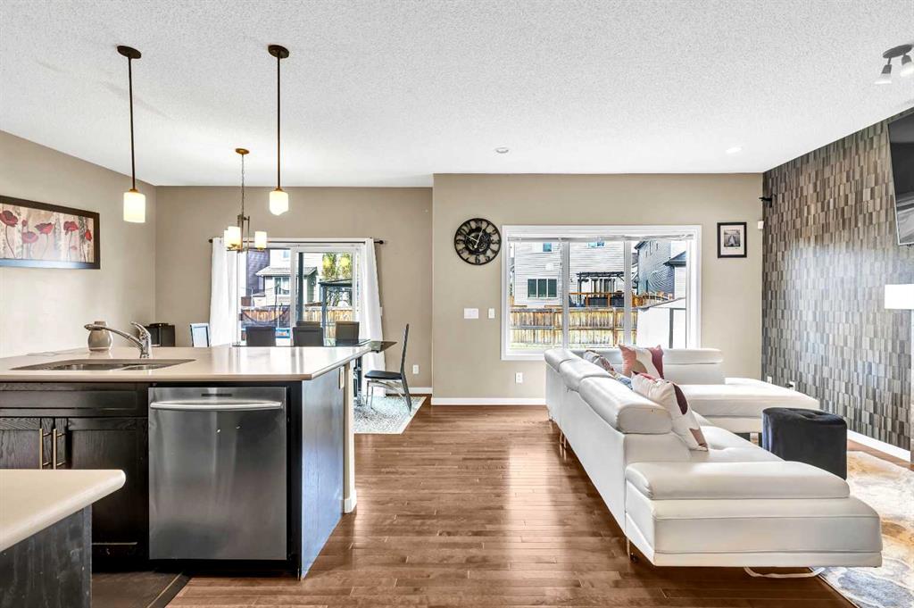 The open concept floor plan is sure to impress and is great for entertaining, large living room with center gas fireplace which is perfect to cozy up to any cold winter nights. The kitchen sits adjacent to the living room and features dark stained cabinets, quartz countertops, stainless appliances and a perfect sized island for gathering, good sized dining nook that is perfect for family dinners, and has double sliding doors that leads to your landscape retreat, park sized backyard, that is complete with stone patio and firepit, for enjoying warm summer nights.