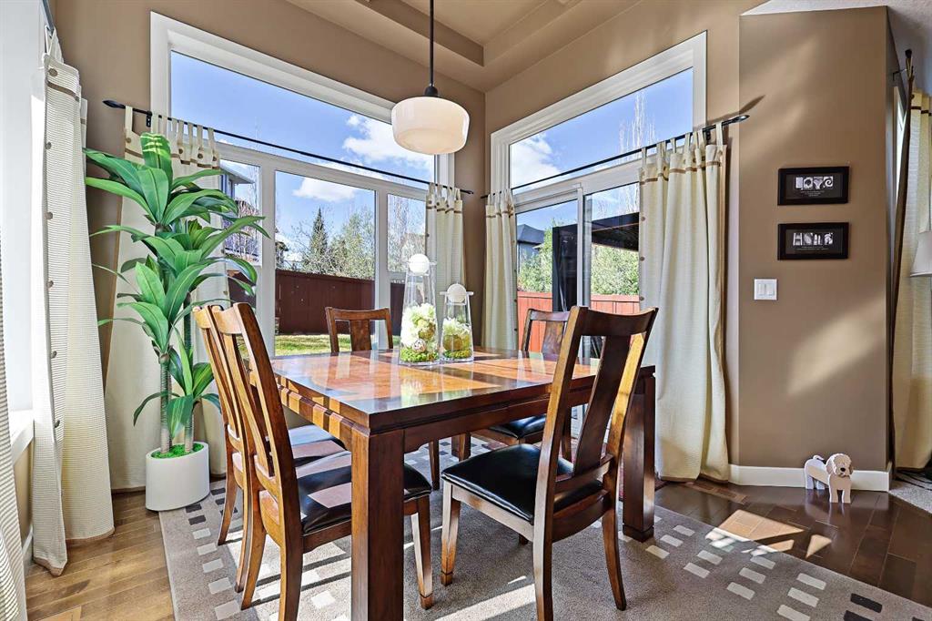 The sunny south-facing breakfast nook with a tray ceiling is ideal for casual meals, opening onto the backyard deck for seamless indoor-outdoor living.