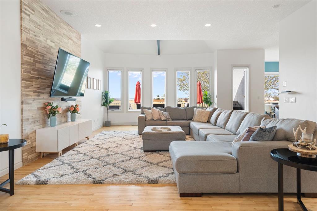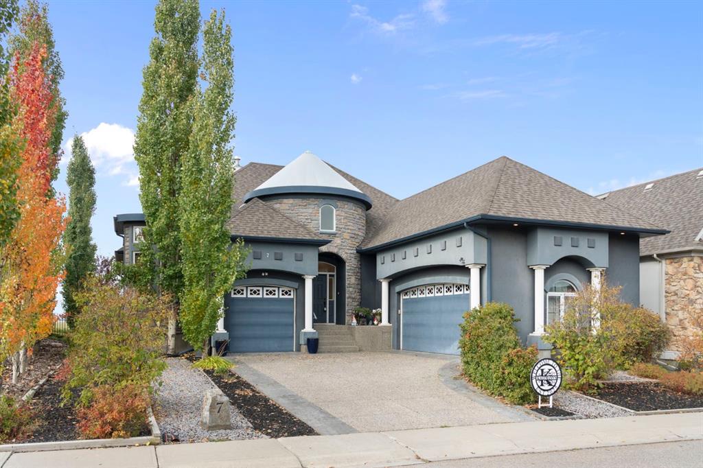 **Click to view our CINEMATIC VIRTUAL TOUR and iGuide** Welcome to 7 Rockcliff Landing—a stunning French Country-style bungalow in prestigious Rock Lake Estates in Rocky Ridge, offering over 4,200 sqft of fully finished living space. A grand main entrance, a bright open-concept main floor, and uninterrupted Rocky Mountain views create an impressive yet inviting atmosphere from the moment you walk in. The main living space flows effortlessly into a private west-facing backyard, backing onto walking trails and green space. Designed for both family life and personal retreat, this home features: Two heated attached garages. Optional his-and-hers home offices. Luxurious primary suite with dual walk-in closets and private ensuites. This home has another 4 bedrooms, including a walk-up basement with separate entrance. Private elevator for full accessibility. The fully finished lower level is a family\'s dream, complete with a rec room, wet bar, steam shower, cold room, and safe room (3\'x4\')—all warmed with in-floor heating. Extras include a custom mudroom with dog wash, flexible office/guest spaces, and abundant storage throughout. Upgrades: $40K into backyard landscaping including a putting green, full central air (2022), water softener (2023), new steam shower unit (2023), new IBC tankless hot water (2023), New carpet on main (2021). Minutes to Royal Oak Centre, walking distance to Co-op, and quick access to major routes—this home offers luxury, comfort, and convenience in one perfect package. Book your private tour today—this gem won’t last!
