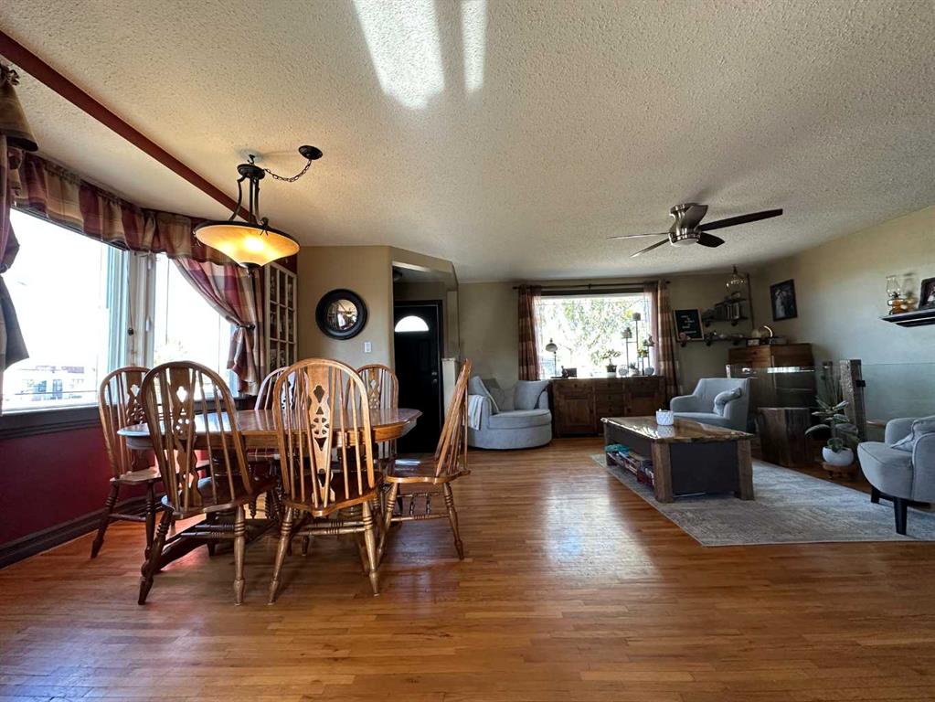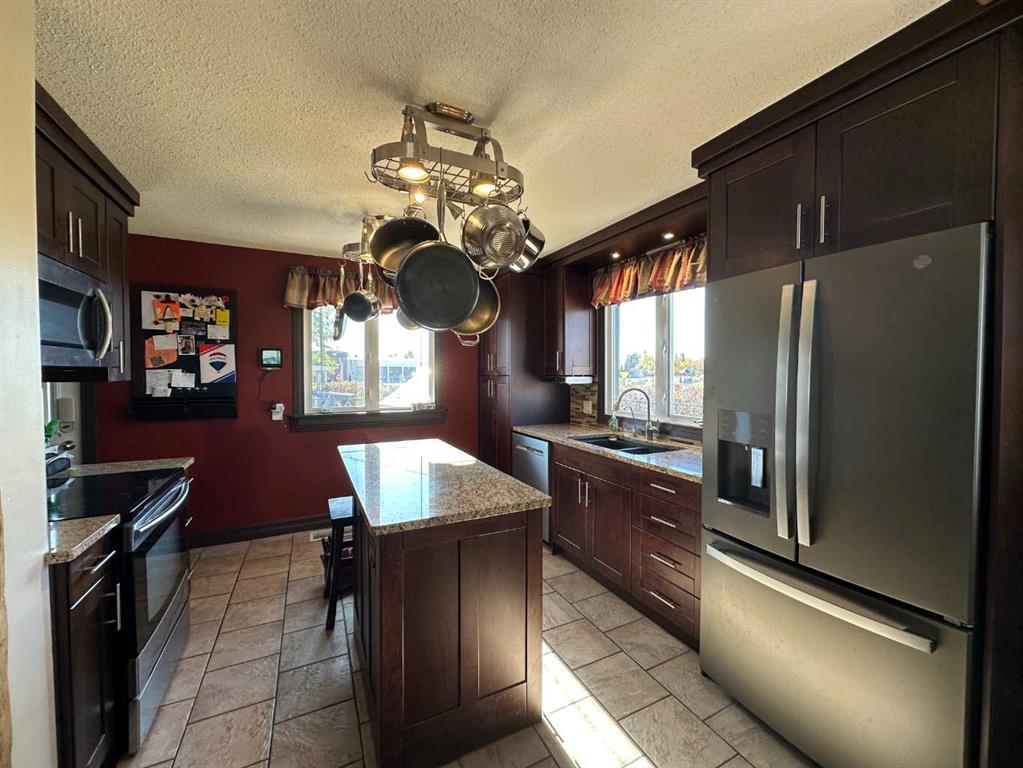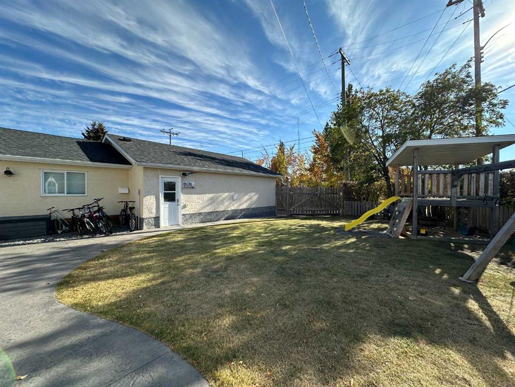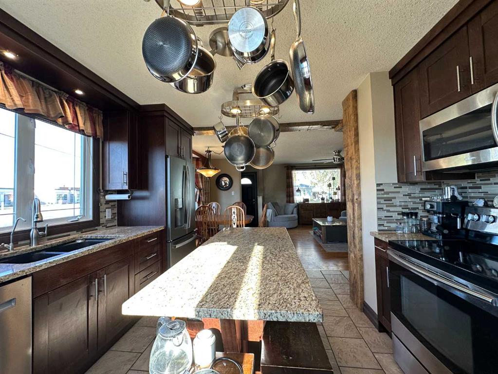 This beautifully renovated 921 sq ft bungalow has undergone a major transformation, both inside and out. The redesigned floor plan includes relocated stairs to maximize storage and improve flow, creating comfortable, functional living spaces throughout. The home offers 4 bedrooms and 2 full bathrooms, with an open-concept main floor featuring a stunning kitchen with granite countertops, an island, and a bright bay window in the dining area. A cozy gas fireplace with a stone front anchors the living room, complemented by rustic reclaimed grain elevator timbers showcased throughout the main level, including the custom fireplace mantle. The home also features all-new windows and retains the charm of its original hardwood flooring. The fully developed basement provides a generous family area, two additional bedrooms, a full bath, and a large laundry room complete with a soaker sink, upright freezer, and abundant storage. A water softener and reverse osmosis system serve both the main and lower levels. Outside, the oversized lot offers exceptional versatility with a 24’ x 28’ heated garage featuring new over head doors and (4) 220 volt plugs. Additional 19’ x 32’ workshop accessible from both the garage and yard. The workshop is equipped with (2)220 volt plugs, in-floor heat and a 2-piece bath (with space for a shower), making it ideal for a home-based business, studio, or potential additional living space (with municipal approval). All of this and still plenty of yard space for play or entertaining. Front curved driveway offers extra parking behind street and garage parking. Located close to schools and shopping. This property is truly a rare find—perfectly combining modern upgrades, rustic charm, and functional flexibility.