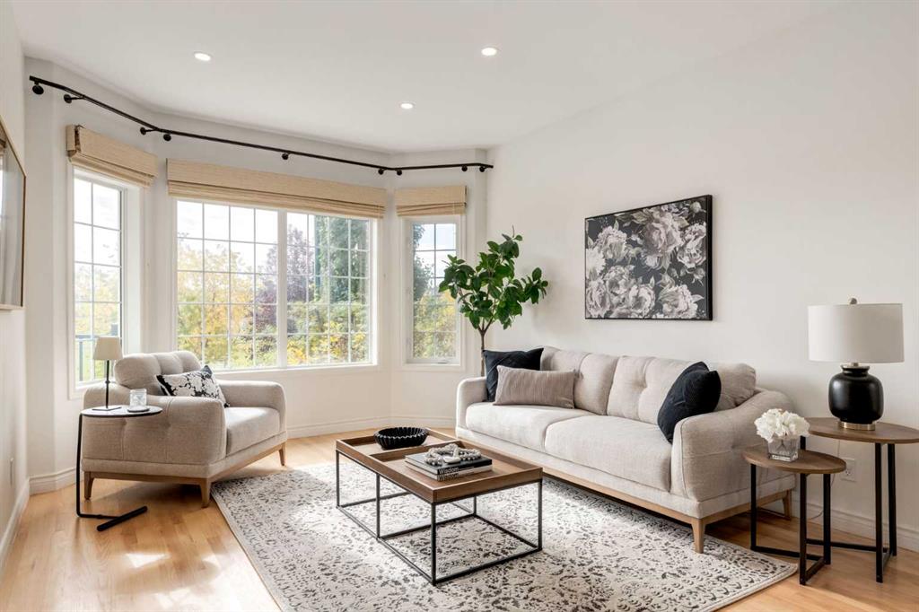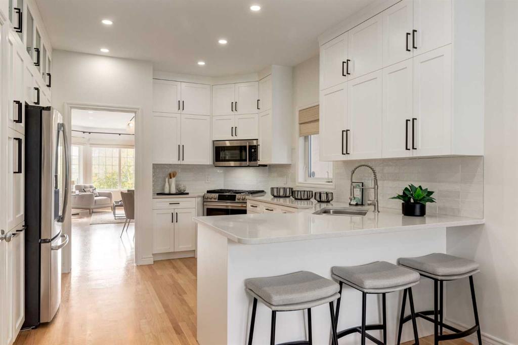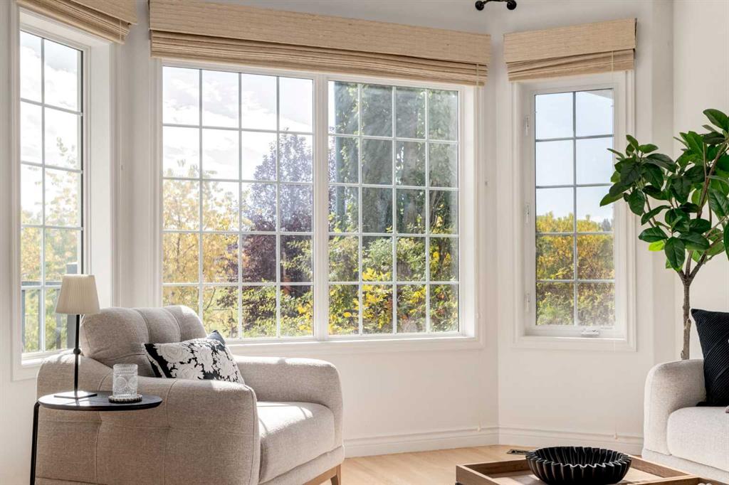Front-row views across from a sprawling soccer field with sweeping vistas of the Bow River and Calgary’s West End skyline. This detached home offers exceptional curb appeal and meticulous landscaping front and back — featuring synthetic grass, natural boulders, and a sunny south-facing front patio with gas fire pit. Inside, you’ll find a bright and spacious layout that shows like new. The front living and dining rooms are bathed in natural light and finished with onsite hardwood, fresh white paint, and stylish lighting. The renovated kitchen boasts quartz counters, quality cabinetry, and an upgraded appliance package. A cozy rear family room with gas fireplace and built-ins opens to the backyard and double garage. The newly finished lower level impresses with high ceilings, large above-grade windows, a sprawling rec room, with a corner gas fireplace and wet bar. There is an elegant full bath, and a spacious bedroom. With a total of 4 bedrooms and 3.5 baths, the upper level showcases a primary suite with skyline views, dual closets, and a sitting nook. Fresh paint, new carpet, upper laundry, skylight, and built-in speakers complete this standout home — steps to Kensington, parks, cafes, and the river pathways.