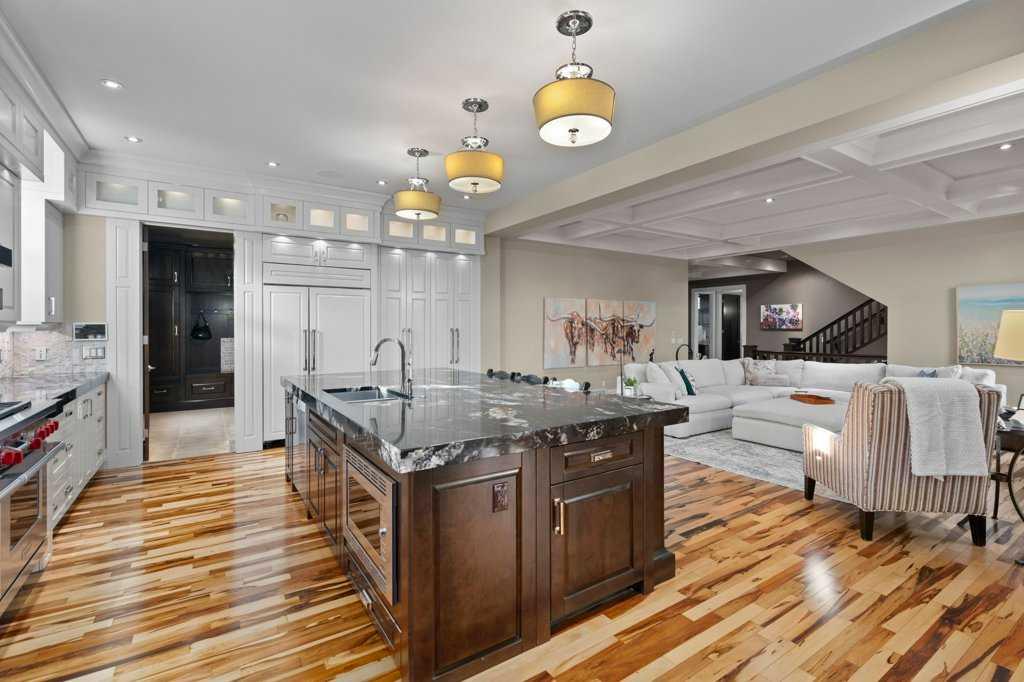 A Fabulous Family Home of architectural significance & exceptional quality, offering over 5,000 sq. ft. in the prestigious community of Heritage Pointe. From the moment you arrive, this residence makes a striking impression with its timber-accented exterior, cedar shakes, stone detailing, and solid wood front door. The double stamped concrete driveway, quad heated garage with epoxy floors, and professionally landscaped yard set the stage for what’s inside. Step into a grand gallery style foyer with limestone inlaid floors, drawing your eye to the open staircase framed by a two-storey stone feature wall. The coffered ceiling in the great room and polished stone fireplace create a warm, luxurious atmosphere that flows seamlessly into the heart of the home. The custom two-tone kitchen is a true showpiece, showcasing stacked light boxes, Sub-Zero and Wolf appliances, exotic stone countertops, and ambient lighting that elevates the overall elegance. The adjoining dining nook opens to a rear deck overlooking a park-like yard — ideal for entertaining or quiet family moments. The main-level primary suite is a serene retreat with doors to the backyard and a spa-inspired ensuite featuring a steam shower, soaker tub, and dual vanities, all finished in refined materials. A private den with rich custom millwork provides an elegant workspace, while the oversized mudroom and laundry area offer everyday convenience with direct garage access. Upstairs, two additional bedrooms, a full bath with dual sinks, and a spacious bonus room provide comfort and versatility. The fully developed lower level is designed for recreation and relaxation, featuring a fourth bedroom and full bath, fitness studio, walk-behind bar, games and rec area, and a projection theatre room perfect for family movie nights. This exceptional home is also equipped with Control4 Smart Home Automation,. Ideally located just steps from playgrounds and green spaces, this home beautifully combines architectural artistry, luxurious finishes, and family functionality — truly a masterpiece in Heritage Pointe. Residents also enjoy year-round lake privileges including paddle boarding, fishing, beach access, pickleball courts, summer camps, community events, and scenic ravines to explore in every season.