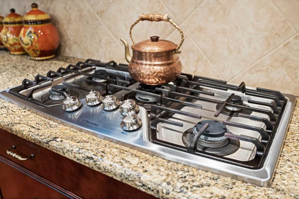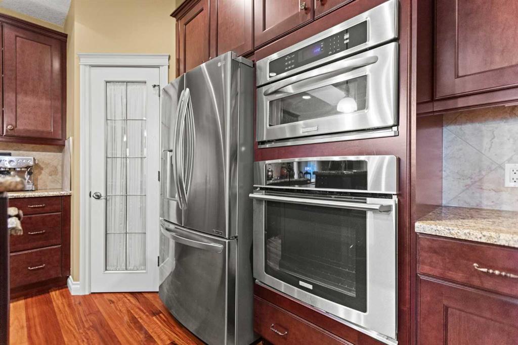 The chef’s kitchen features espresso/cherry-stained cabinetry, granite countertops, a large island with breakfast bar, and stainless-steel appliances, including a wall oven, convection microwave, gas cooktop, Bosch dishwasher, and a reverse-osmosis faucet. Adjacent, the spacious dining room is ideal for entertaining, complete with a built-in china hutch for elegant display and storage. The walkthrough pantry connects to the mudroom/laundry, featuring a sink, cabinetry, shelving, walk-in coat closet, and gas and electric dryer connections.
