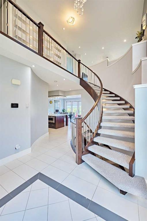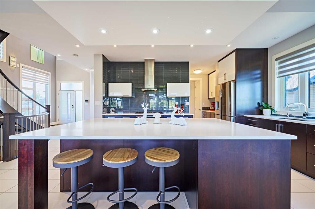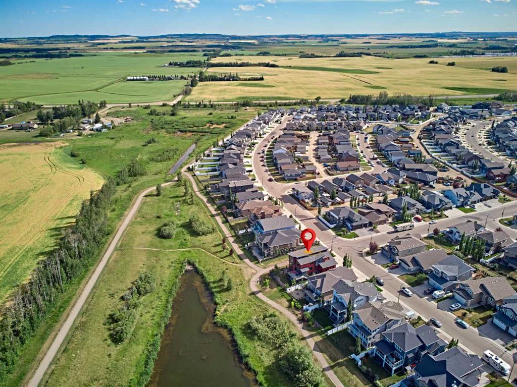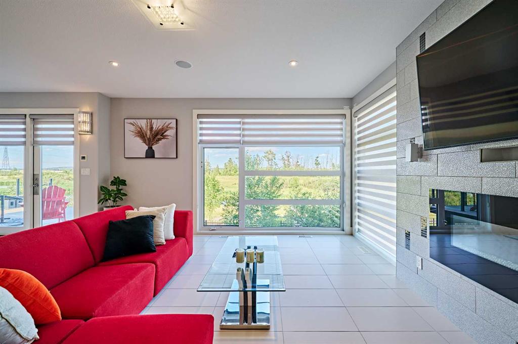 This Original Owner customer built, Modern, Luxury, awards winning home is surrounded by a stunning green belt, natural reserve, and a pond from the back. TRIPLE attached garage with gas heater, fully finished WALKOUT basement. CURVED stairs with open risers going up, in-floor heating on all Three levels. 9 ft high on each level. Air Conditioning. HRV and Sound system throughout the house including the garage and main level deck. This modern contemporary home has more than 3700 sqft living space. The vaulted ceiling is 27 ft. the open-concept design offers breathtaking views from every corner of the house. Sitting in the living room with floor-to-ceiling windows, the magnificent view helps melt away all the stresses. The electric fireplace is surrounded by the artistic titled wall brings you the feeling of such a beautiful life. The kitchen boasts gleaming quartz countertops, a missive panty, and walnut ample cabinetry. Entire main floor is tiled with in-floor heating. Come and experience the essence of luxury and peaceful living. Upstairs offers even more significant views from the master bedroom and family room. you will be energized by the morning sun. A double-sided gas fireplace adds luxury to your bathing and reading rituals. you will be amazed by the architecturally designed walk-in closet, and fully titled jet tub. The laundry room is thoughtfully accessible from the hallway serving two more spacious bedrooms on the upper level. The basement is a paradise for you and your loved ones, featuring a fully equipped home theatre, a wet bar. the spacious living room is a dream place for your musical instruments, or your precious fitness equipment. An additional bedroom provides extra space for family or friends. The entire home has 9\' ceilings, 8\' solid interior doors. 2022 furnace. Softer water and RO water. electrical rough-in for a backyard hot tub. The yard is fully fenced, professional landscaped, lots of fruit trees and vegetable gardens plus a fishpond. The entire house offers a dream setting for a luxurious lifestyle.