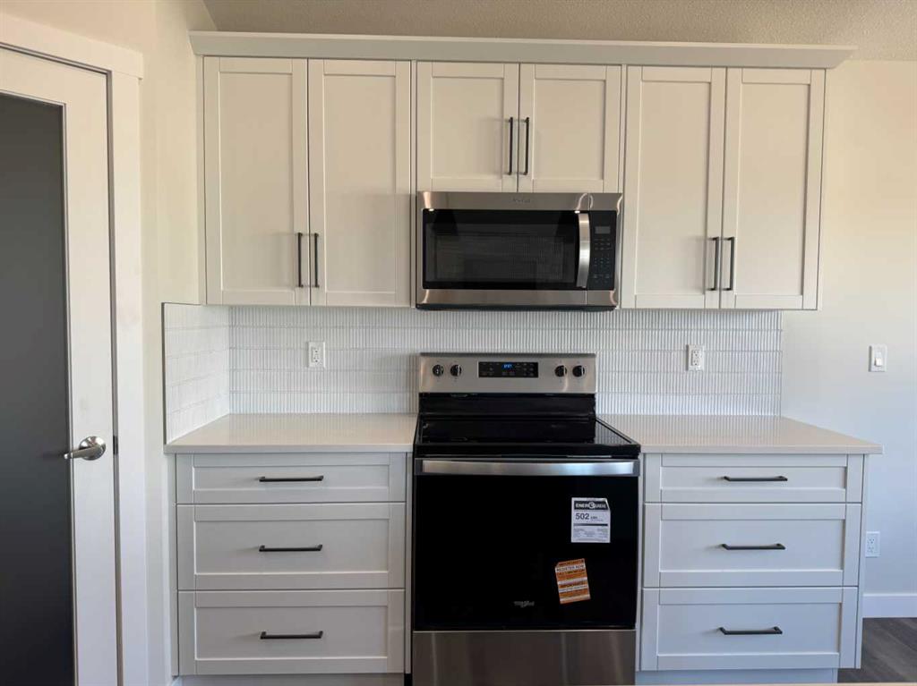 IN A DESIRABLE QUIET CLOSE LOCATION IN VALLEY RIDGE BLACKFALDS WITH A WALKOUT BASEMENT! WELCOME TO THIS SAN MARIA HOMES NEW BUILD MODIFIED BILEVEL! Enter to a spacious and tiled entry leading to the MAIN LEVEL OPEN PLAN LIVING/DINING/KITCHEN with luxury vinyl plank flooring, vaulted ceilings and an eye-catching electric fireplace with a floor-to-ceiling accented stone surround. Crisp white linen paint throughout! Impressive and Functional Dream Kitchen with white cabinetry/quartz countertops/center island with extended breakfast bar/pantry and all stainless steel appliances included (fridge with water!). The dining area, adjacent to the kitchen, is a generous size with a garden door out to the deck with a metal railing surround. Two secondary bedrooms on the main level and the main 4 pce bath with quartz countertop. The Primary Bedroom on the upper level has a walk in closet and 4 pce ensuite with quartz countertop and tile floor. The WALKOUT BASEMENT is open for development with 9 ft ceilings and sliding doors leading out to the concrete patio.....The basement also has roughed-in infloor heat and a furnace /laundry room combination that is framed and drywalled... The backyard is fenced on two sides! TAXES NOT YET ASSESSED.....