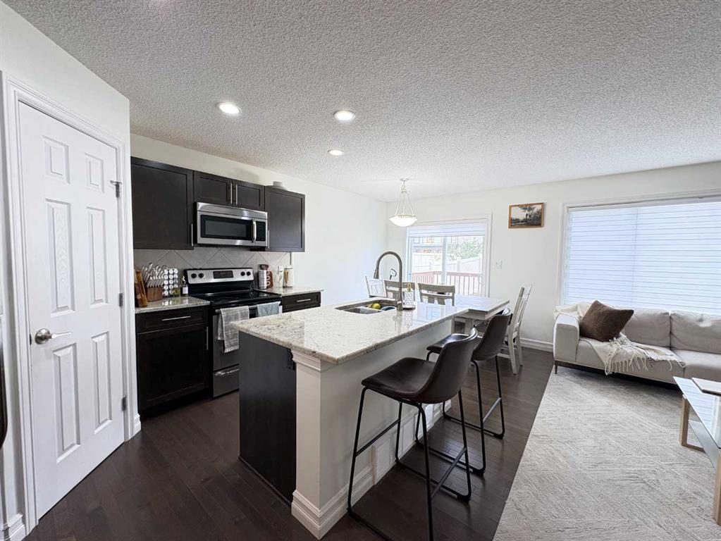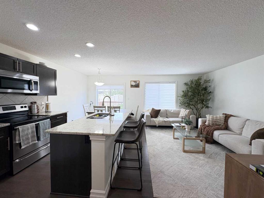 countertops, island with seating, and a bright and spacious functional living space. There is a set of patio doors that lead out
