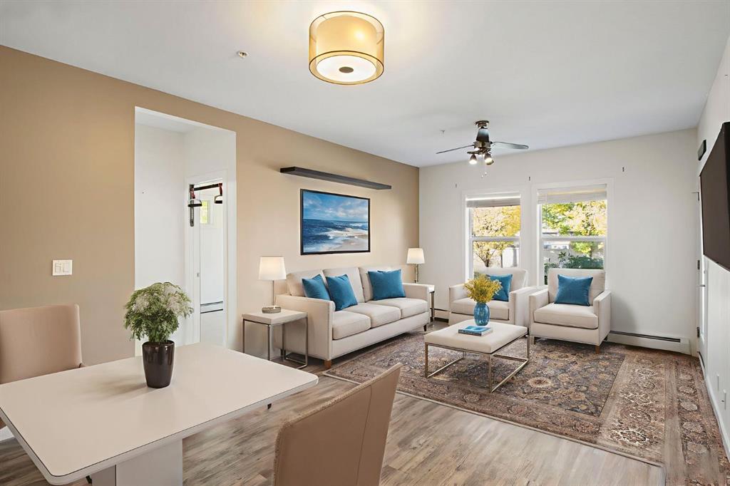 CRANSTONS BEST PRICED APARTMENT! Experience AMAZING value in this well kept, freshly updated ground floor unit that features over 900 sq/ft of developed living space, 2 bedrooms, 2 bathrooms and only 1 party wall. Entering the unit you\'re welcomed with a proper hallway that has a closet, your stacked laundry and tile floor. Walking into the open floor plan you\'ll love the full sized kitchen with a loads of countertop space, a pantry and open site lines to your dining and living room with vinyl flooring. The living room has generous WEST FACING windows, a practical layout for easy furniture configuration and access to your covered patio. The primary bedroom has room for a king bed, brand new carpet, a walk through closet and a 4 piece en suite. The secondary bedroom is also a good size with brand new carpet while being conveniently located next to your second 4 piece bathroom. This unit also comes with an out of unit storage locker, assigned outdoor stall and is conveniently located near street parking where you\'re always able to find a spot. This complex is located just steps from 3 Schools, a bus stop, Sobey\'s banks, restaurants and a short drive to Cranston Community Centre. With Fish Creek and Seton being short drives away, this unit has everything you could ask for at an attractive price.