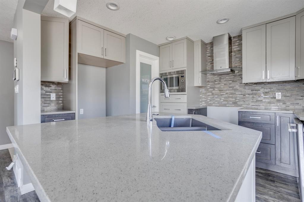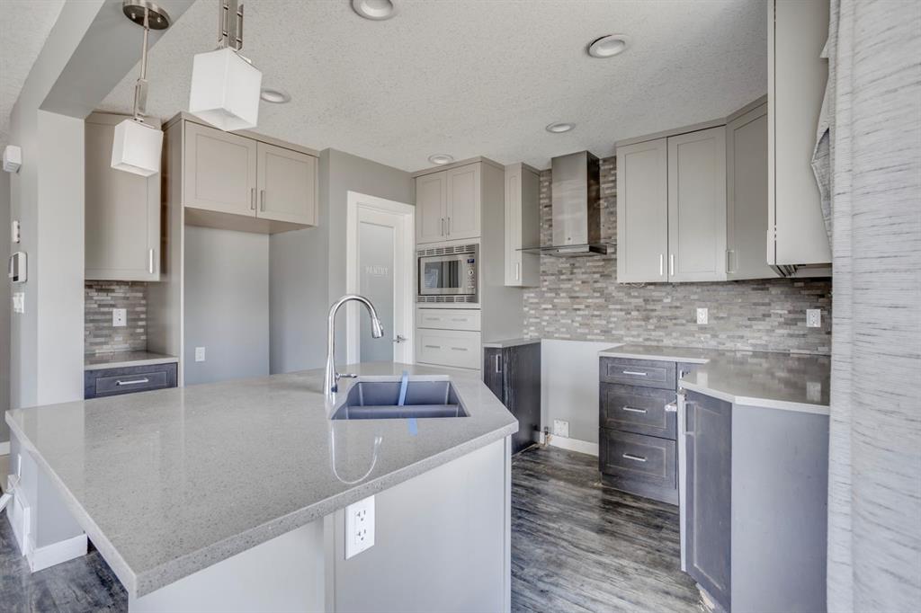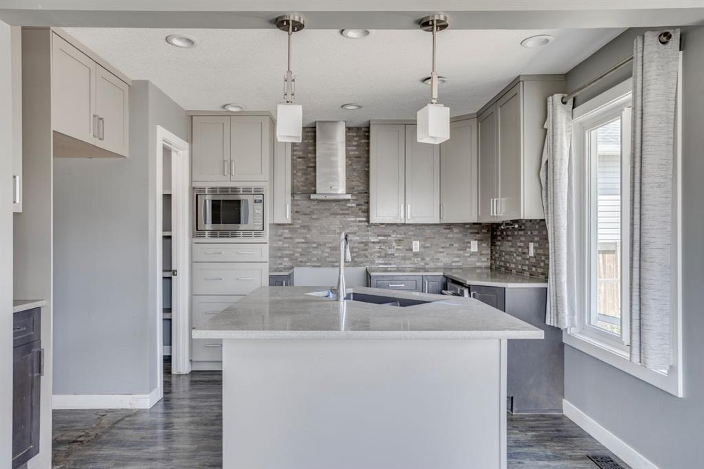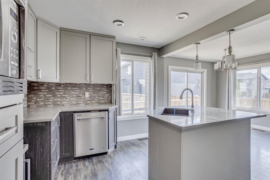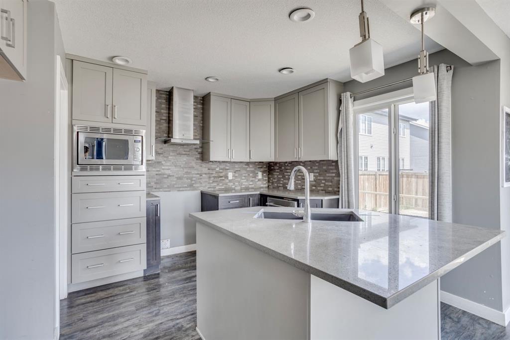 The heart of the home is the stylish kitchen, thoughtfully designed with two-tone cabinetry, quartz countertops, a centre island with breakfast bar seating, a sleek glass tile backsplash, and a modern range hood. Adjacent to the kitchen is a well-lit dining nook with direct access to the backyard through sliding patio doors — perfect for entertaining or enjoying outdoor meals.