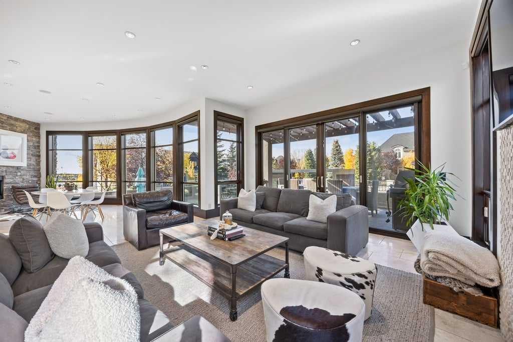 Outside, the property transforms into a private retreat designed for year-round enjoyment. Highlights include multiple patio spaces, a fire-pit, a covered hot tub area, an outdoor putting green, and an elevated deck with clear glass railing and BBQ—a seamless extension of the home’s indoor living spaces.