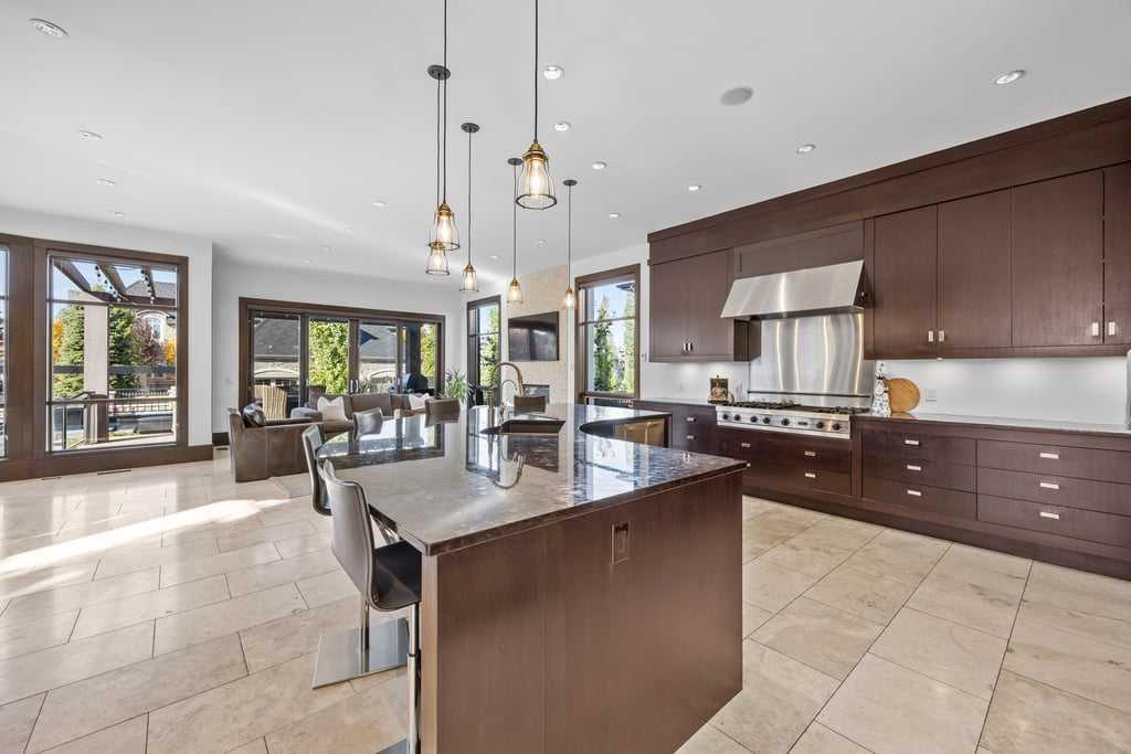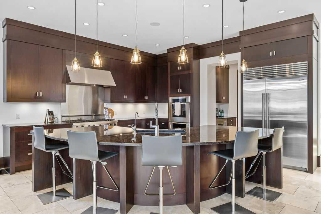 The chef-inspired kitchen is the true heart of the home, combining form and function with a curved granite island, Sub-Zero and Wolf appliances—including a six-burner gas cooktop, double wall ovens, two dishwashers, and an integrated side-by-side refrigerator. A butler’s pantry and wet bar make entertaining effortless, whether hosting a quiet dinner or a lively gathering.