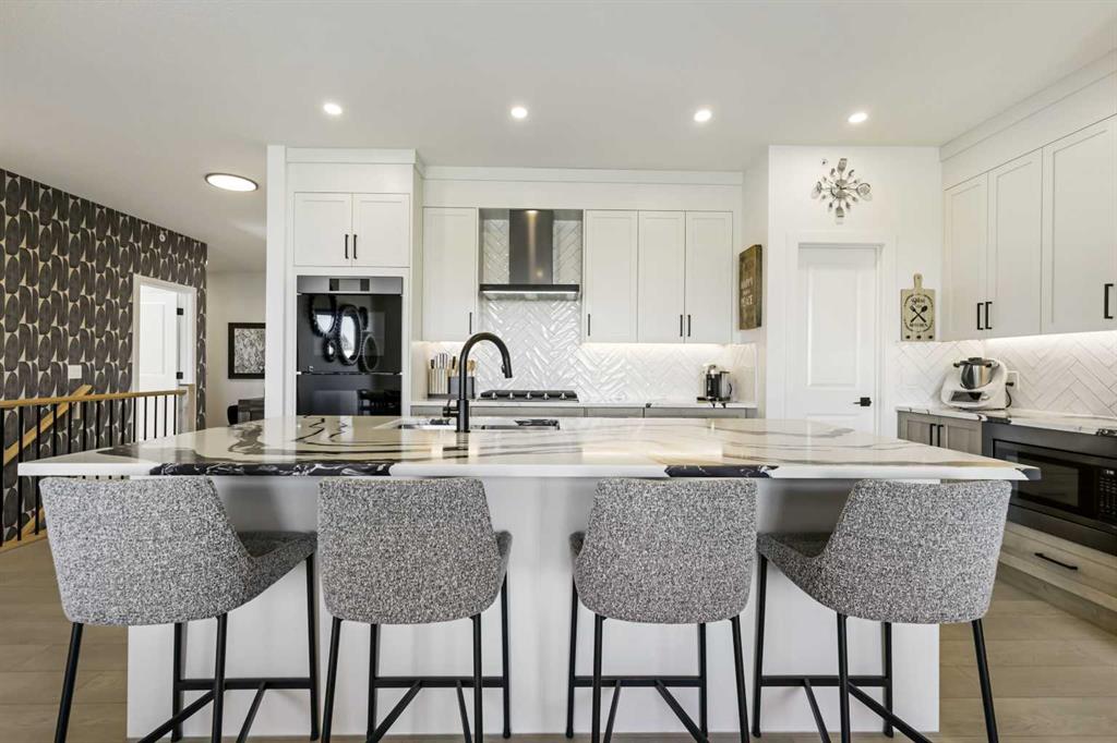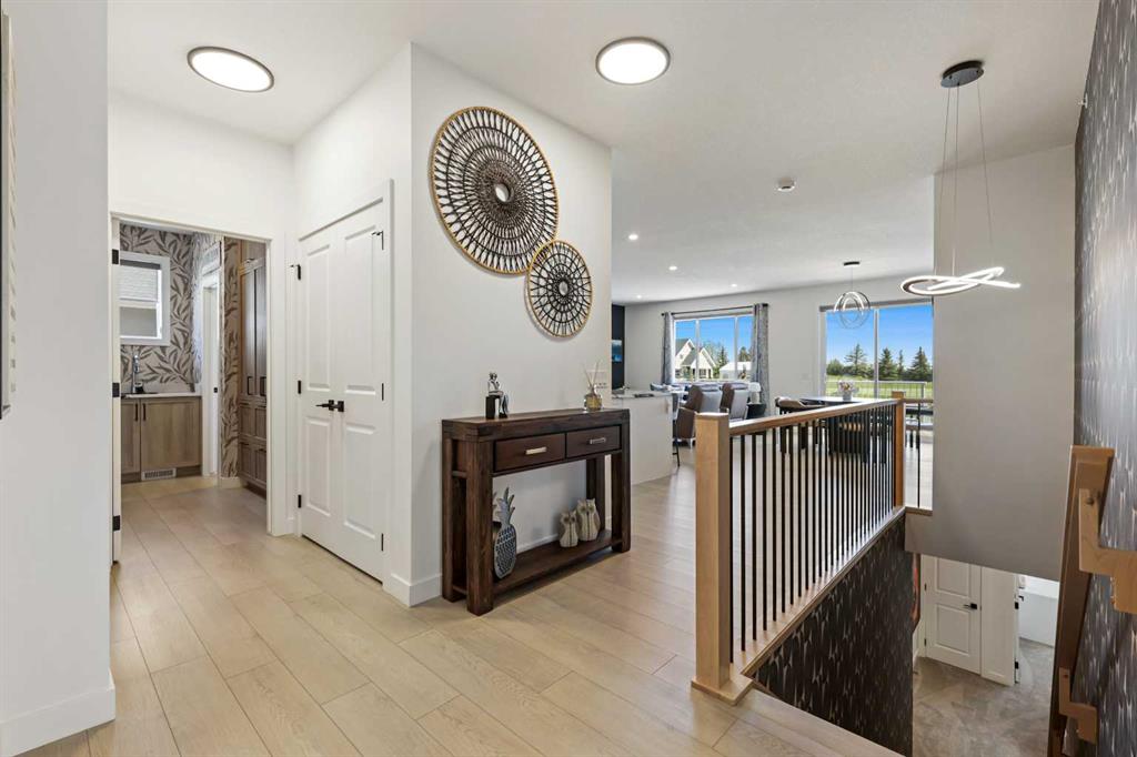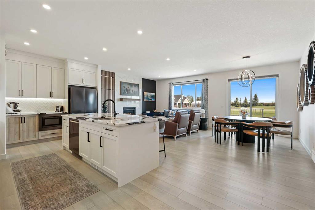 This pristine 5-bedroom, 3-bath bungalow offers a perfect blend of style, comfort, and function, ideal for families, retirees, or anyone looking to escape the buzz of the city. With James Hardie Board siding, you get lasting quality and curb appeal, further elevated by a triple car garage featuring elite walnut carriage doors, black satin windows and hardware, with epoxy finish inside the garage. The aggregate driveway and sidewalk are beautifully finished and built to last, while gemstone lighting adds charm and elegance in the evening. Inside, you\'re welcomed by a large foyer with stunning luxury vinyl flooring, two closets and a wide-open layout filled with natural light. The open-concept kitchen includes a large island, quartz countertops, gas stove, double oven, upgraded hood fan, herringbone backsplash, upgraded lighting, and a walk-through pantry leading to a mud/laundry room with a sink, built-in shelving, and cupboards. The living room features a gas fireplace and a stylish feature wall, with patio doors opening to a back deck perfect for BBQs, relaxing with friends, or practicing your putting. The primary bedroom is a private retreat with a large soaker tub, walk-in shower with quartz bench, private toilet room, and a spacious walk-in closet. Also on the main floor is another bedroom and a 4-piece bath. Downstairs, enjoy a comfortable basement with upgraded carpet and 10lb underlay, a large family room with a wet bar, three spacious bedrooms, a 4-piece bathroom, and a sizable utility room with extra storage. With thoughtful upgrades throughout, this move-in-ready home is a showstopper. Located just 25 minutes to Calgary or 20 minutes to Strathmore, this is an incredible opportunity to own a high-quality home in a peaceful community—contact your agent today for a private showing.