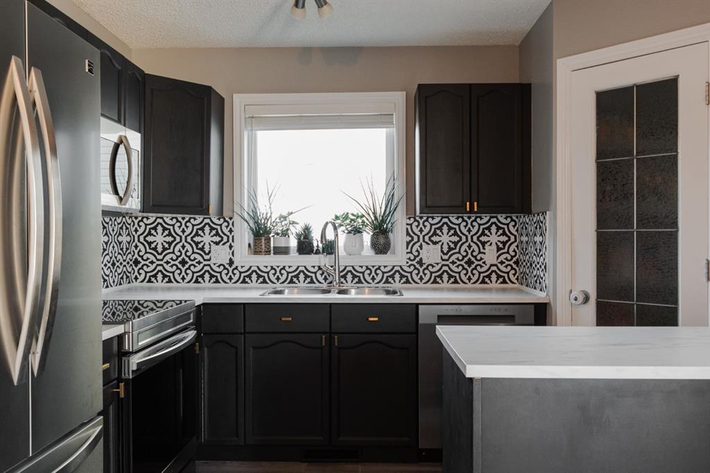 Inside, the main level offers a warm and modern aesthetic with laminate floors and a comfortable living room anchored by a gas fireplace and grey and gold accent wall. The kitchen has been refreshed with painted cabinetry, modern gold hardware, new countertops and a floating island offering additional prep space. A pantry offers practical storage, and brand-new appliances—including the fridge, stove, dishwasher and microwave—all installed in 2025, complete the space. A powder room and main floor laundry add everyday convenience.