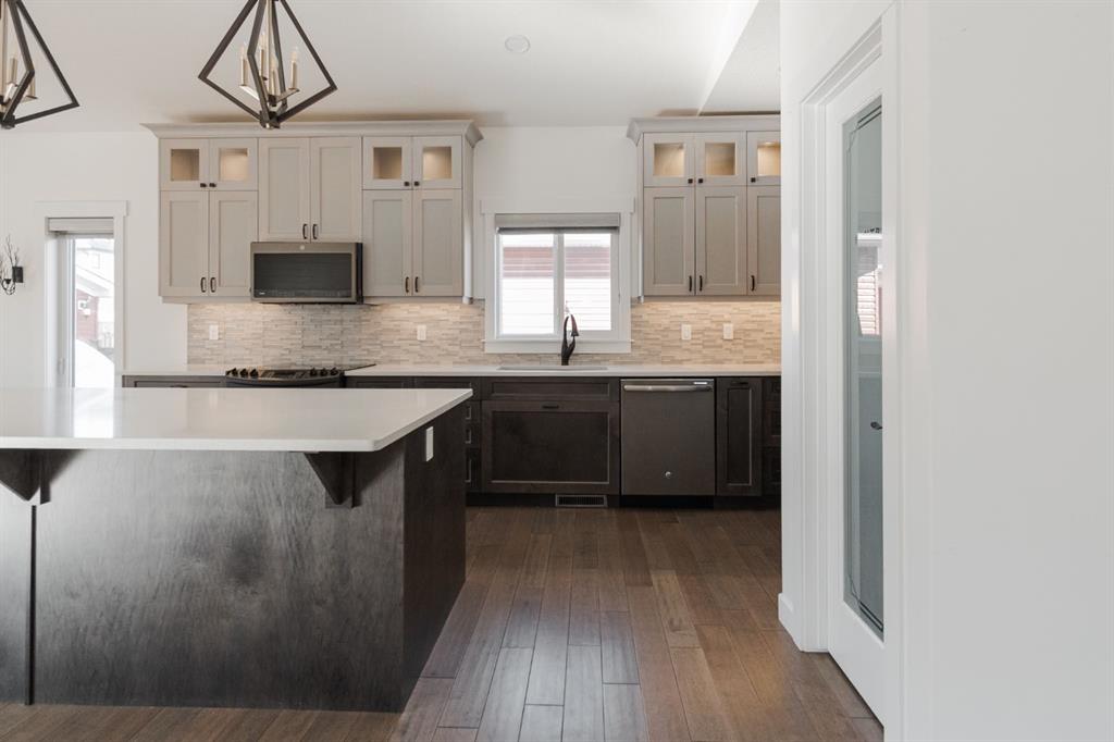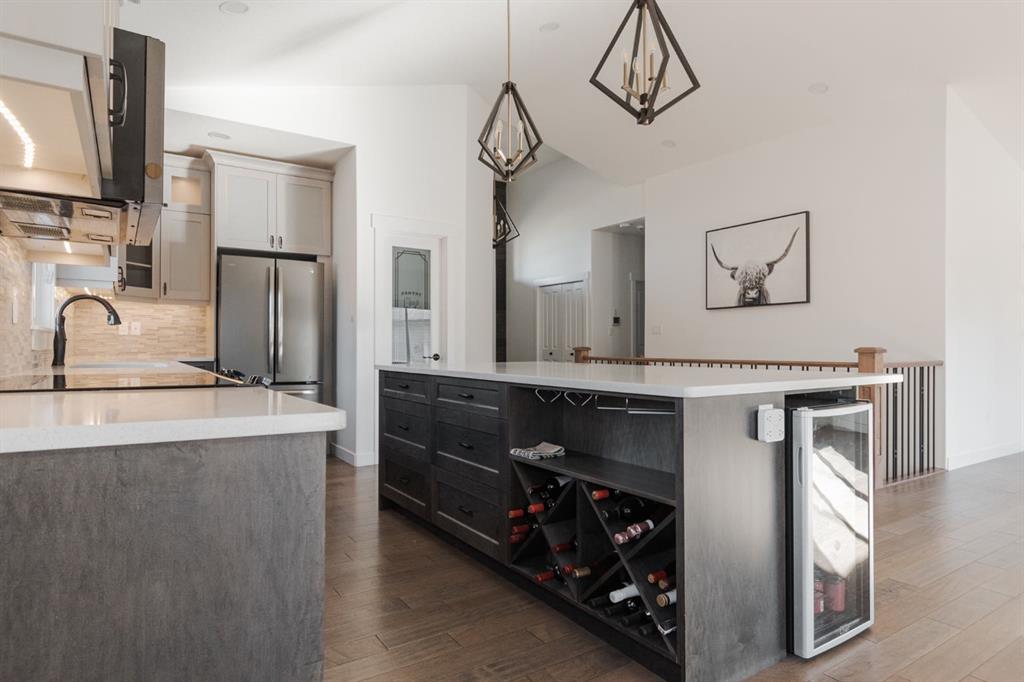 The main level is warm and inviting, defined by high vaulted ceilings, engineered hardwood floors, and carefully selected designer lighting. The kitchen is the centrepiece of the home, offering modern shaker cabinetry, soft-close drawers, under-cabinet and in-cabinet lighting, quartz counters, and a stunning oversized island with a beverage centre. A walk-in pantry provides exceptional storage, and a large window over the undermount sink brings in natural light while offering a lovely yard view. The dining area flows seamlessly from the kitchen and features a wood accent wall and garden doors that open onto the backyard.