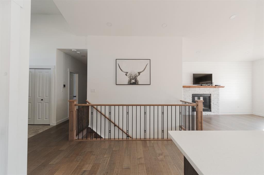 The living room offers an elegant yet comfortable space to gather, anchored by a gas fireplace with a rich wood mantle, shiplap feature wall, and custom window coverings. Down the hall, the primary retreat is a private escape with a modern barn door entry to the ensuite, dual vanities, custom-tiled shower with dual shower heads, built-in shelving, and a generous walk-in closet. Two additional bedrooms with closet built-ins and a four-piece bathroom complete this level along with a spacious main floor laundry equipped with cabinetry and a drying station.
