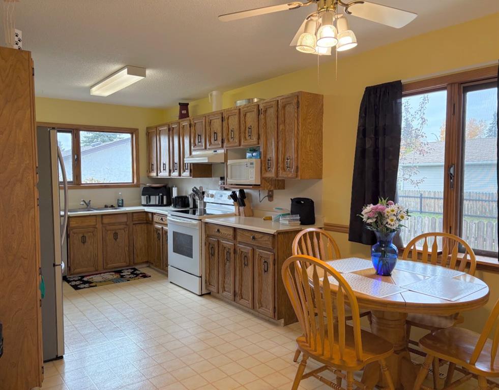 Bungalows are a hard find and makes this home a great fit for any buyer at any stage of life! Step inside this bright home featuring a front living room with a large window overlooking the quiet culdesac. The kitchen and dining room feature a good amount of cabinet space, a window overlooking the back yard and some updated appliances. 3 bedrooms and a full bathroom on the main level and a large fourth bedroom in the basement. The basement also offers a good size family room space, very large laundry/storage room, a second bathroom and an area started for a fireplace or wood stove if desired! The fenced backyard is a nice size and offers a concrete patio, fire pit area, room for a garden and space to play. Parking galore with the detached garage, long driveway and an additional concrete pad off the back of the garage with back alley access. The options are endless! Recent updates include shingles on the house and the garage and insulation blown into the attic making the home more efficient and easy to heat. Other updates over the years are the furnace, hot water tank, paint and some carpet. A solid home is found here - in a great location close to three parks, many schools and the towns walking trail.