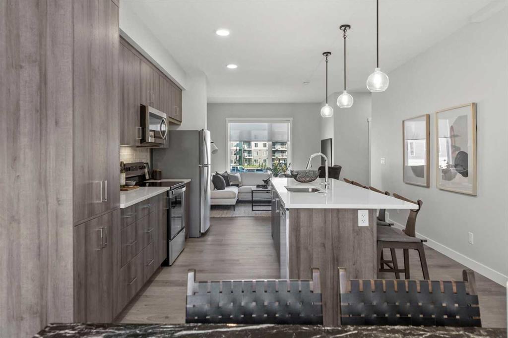 Discover contemporary living in this brand-new 2025-built townhome, ideally situated in the sought-after community of Shawnee Slopes in Southwest Calgary. With over 1,440 sq ft of thoughtfully designed space, this 3-bedroom, 2.5-bath home seamlessly combines modern style with everyday functionality. The open-concept main floor showcases a sleek, modern kitchen featuring rich cabinetry, premium stainless steel appliances, a built-in pantry, crisp white quartz countertops, and an oversized island that’s ideal for casual dining or entertaining. Dedicated west facing dining space and a bright spacious east facing living room allow sunshine to be enjoyed at all times of the day! Durable luxury vinyl plank flooring throughout all three levels creates a clean, cohesive aesthetic, while a neutral colour palette adds to the home’s timeless appeal. Step outside to a private west-facing balcony with no neighbours behind, complete with a gas line—perfect for effortless outdoor cooking and relaxation. Upstairs, you’ll find a well-appointed primary bedroom with ensuite, two additional well-sized bedrooms, full bath and the convenience of upper-level laundry. Additional highlights include air conditioning rough-in, a custom blind package, upgraded wall tile detailing in upper bathrooms, and an attached double tandem garage with extra storage and backyard access. Perfectly positioned near public transit, the CTrain, top-rated schools, shopping, dining, and the natural beauty of Fish Creek Park, this location also provides easy access to Stoney and Macleod Trail, the nearby YMCA, Costco and weekend getaways to the mountains.Whether you\'re a first-time buyer, investor, or looking for your next home, this pet-friendly property is a rare opportunity to own a brand-new townhome in one of Calgary’s most established and connected neighbourhoods.