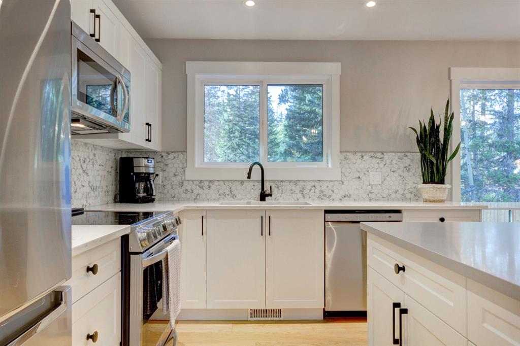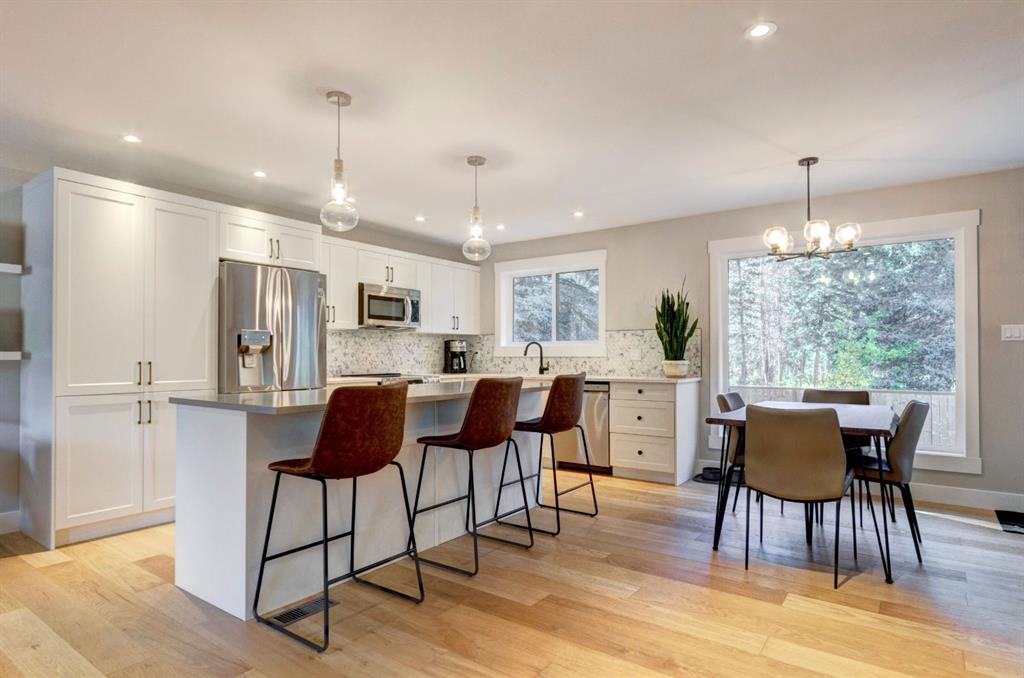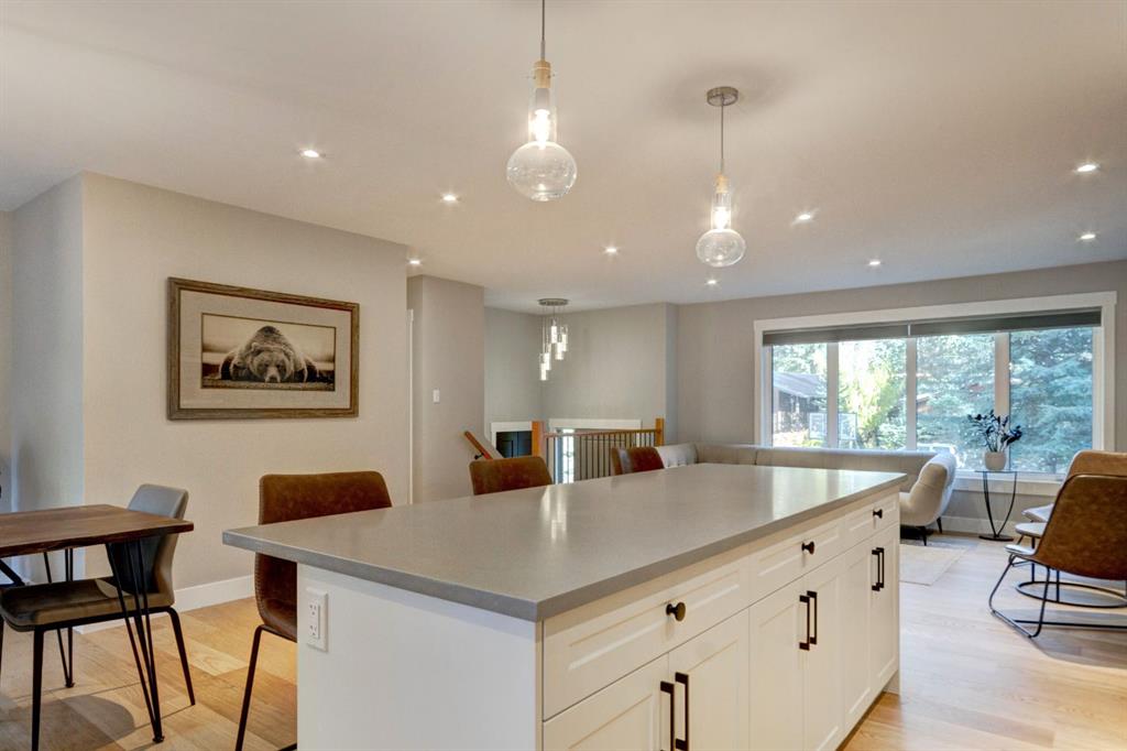 Fully renovated home on a quiet lot – steps from downtown. Beautifully updated home located in Canmore’s Larch neighbourhood. Set on a quiet lot with no rear neighbours, this property offers privacy and tranquility—just a short walk to downtown and the Bow River. With 1,936 sq ft of fully renovated living space, the home combines modern comfort with timeless mountain charm. The bright and open main floor features a thoughtfully designed kitchen, spacious dining area, and a cozy living room centered around a floor-to-ceiling natural stone gas fireplace. Three spacious bedrooms and two full bathrooms on the main level provide ample room for family or guests. The fully finished lower level adds even more space, with a large family room, fourth bedroom and third bath. Step outside to an expansive deck and fully fenced backyard—perfect for soaking in the mountain air. The oversized heated double garage offers plenty of storage and recent upgrades including a high-efficiency furnace and new windows enhance year-round comfort and energy savings. Enjoy panoramic mountain views from both the front and back of the home, and experience the peaceful atmosphere of one of Canmore’s most established and beloved neighbourhoods.