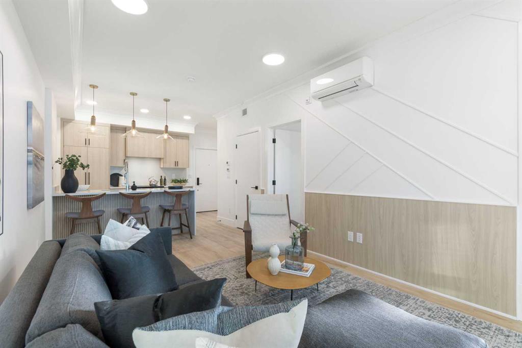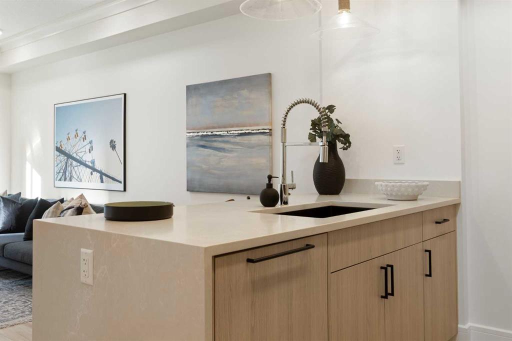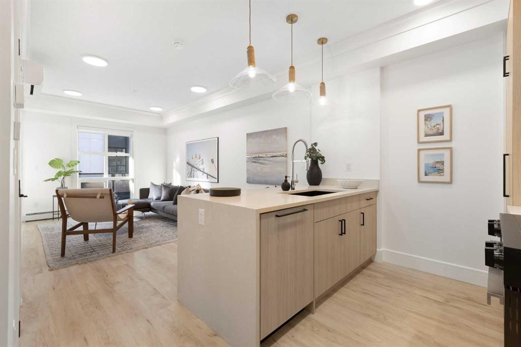 Be the very first to call this pristine, never-lived-in home your own—a sun-filled, modern retreat where every detail feels fresh, flawless, and intentionally designed for the way you live. From the moment you step inside, the open layout draws you in, anchored by a showpiece kitchen where a sleek quartz waterfall island meets premium stainless steel appliances (notice the cabinet front dishwasher and fridge!), an upgraded hood fan, and an oversized sink that makes both cooking and hosting effortless. Natural light pours through oversized windows into both the bedroom and living room, creating a warm, airy atmosphere. Your spacious bedroom easily accommodates a queen bed with nightstands. The bathroom echoes the home’s elevated design with quartz countertops and high-quality fixtures including upgraded tile from the tub to the ceiling, upgraded black rainfall shower head w/ wand & the tile backsplash spans the height of the wall above the beautiful vanity w/ quartz counters! Step outside to your private second-floor balcony—perfect for morning coffee, summer BBQs, or winding down with your favourite beverage as the sun sets. Comfort is elevated with central air conditioning, in-suite laundry, and a titled underground parking stall, plus visitor parking and secure bicycle storage for added convenience. Set within Dean’s Landing in Calgary’s sought-after University District, you’re surrounded by a vibrant, walkable community where trendy cafés, restaurants, and everyday conveniences are just steps from your door. Enjoy easy access to green spaces, bike paths, the University of Calgary, Foothills Medical Centre, and downtown—blending urban energy with neighborhood charm. This unit won’t last long! Call your favourite realtor today to book a private viewing of this beautiful condo.