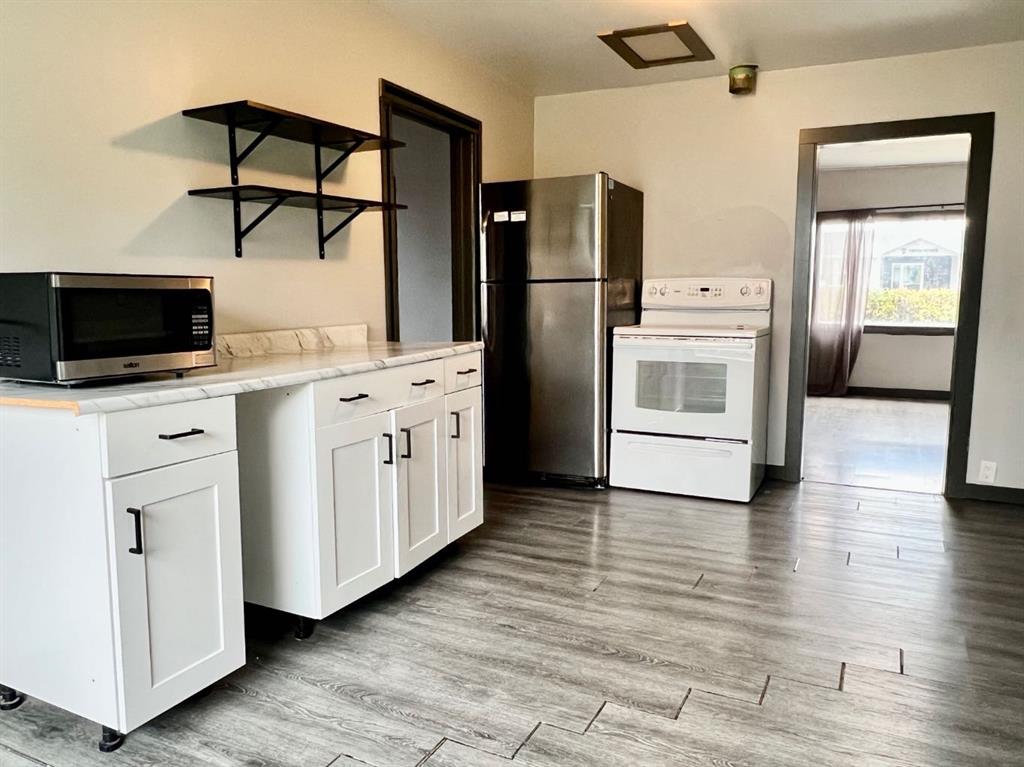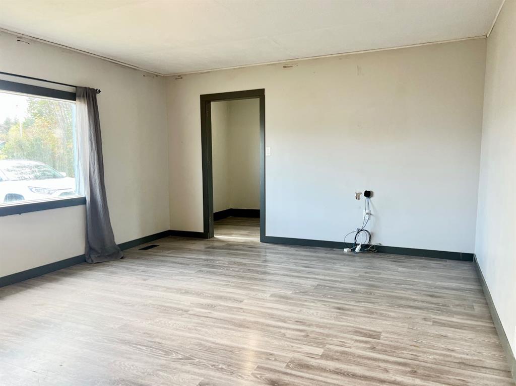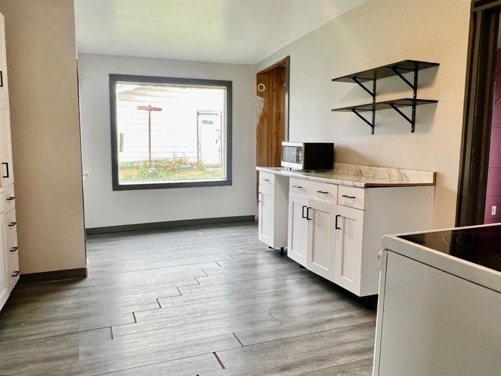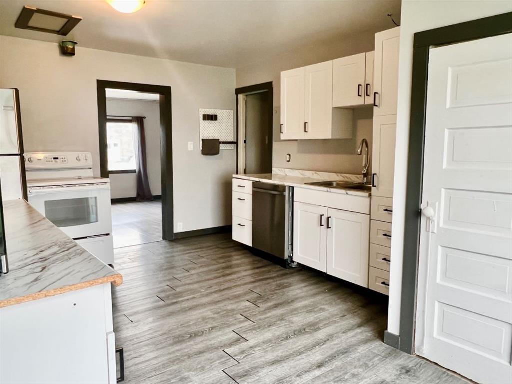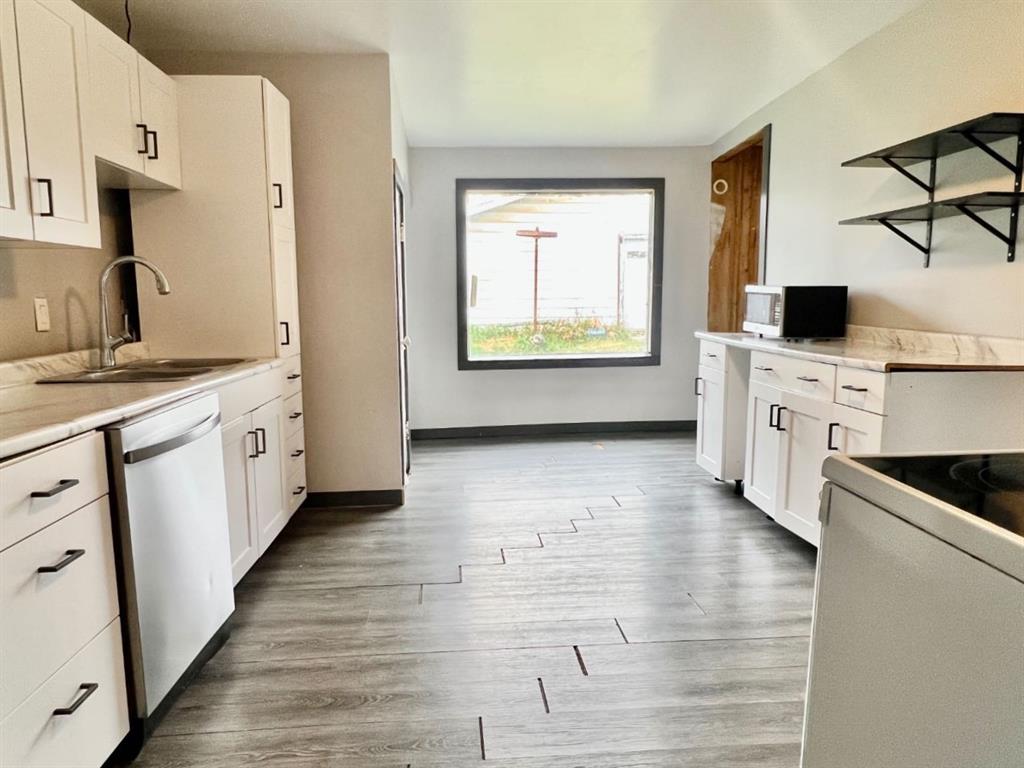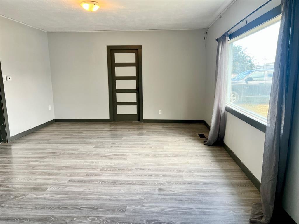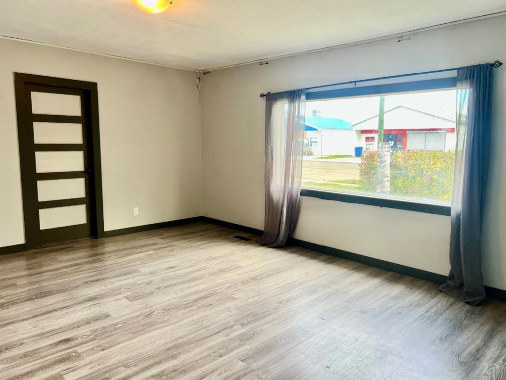 Affordable bungalow in the quiet community of Eckville! This home is just a short walk to local shopping and amenities. Step into a spacious entryway that opens into a bright living room with a large south-facing window for plenty of natural light. Offering 2 bedrooms plus a den that could easily be converted into a 3rd bedroom with the addition of a door and opening window. The kitchen has been updated with newer cabinets and countertops. Convenient main floor laundry is located at the back entry with good storage space. The 4-piece bathroom has also been updated. Enjoy easy-care laminate flooring throughout and a newer hot water tank. Convenient front drive for additional parking plus a mature hedge in the front for privacy from the street. The fenced backyard features a double detached garage with back alley access. Quick possession available.