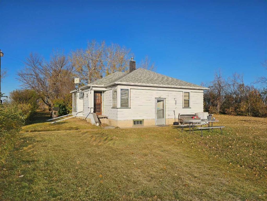 This charming 915 sq. ft. two-bedroom bungalow offers peaceful country living just five miles from Nanton, with four miles of pavement and only one mile of gravel road. Nestled on 3.36 acres, the property is surrounded by a mature shelterbelt on the north and west sides, providing privacy and protection, while open farm fields stretch to the east for beautiful sunrise views. The home features main floor laundry, warm fir floors (also under lino), updated wiring and plumbing, a 15-year-old furnace, and a brand-new hot water tank installed in 2024. The 40-year shingles, added in 2008, ensure lasting durability. A spacious 36\' x 28\' triple-car garage with a metal roof and its own panel box offers ample room for vehicles and hobbies. Additional outbuildings include a 10\' x 20\' powered shed, a 12\' x 16\' shed that once served as the original homestead, and other sundry storage buildings providing plenty of space for tools, equipment, or creative projects. A peaceful rural setting this acreage combines comfort, character, and convenience.